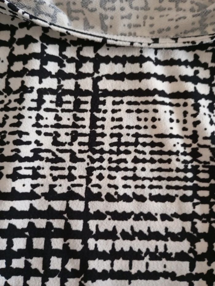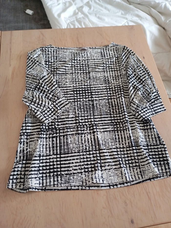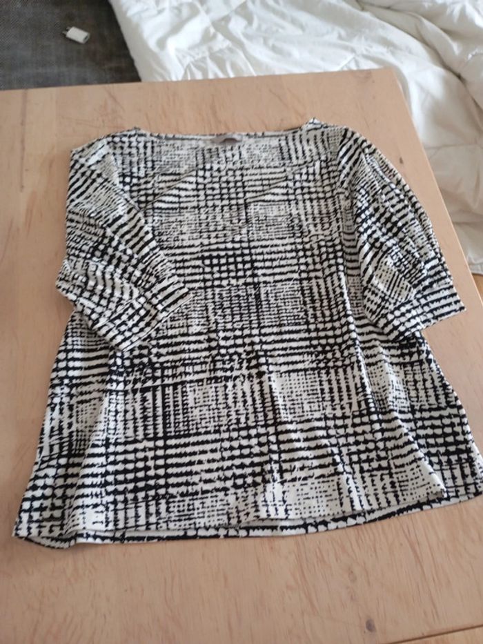 Blouse noir blanc .col plat. Matière souple .manche bouffante