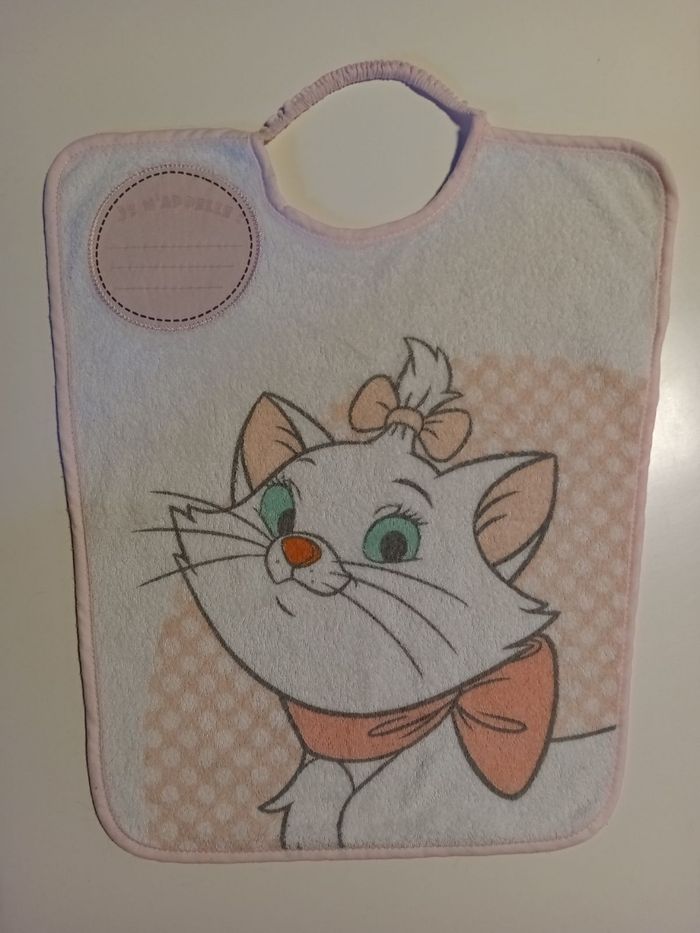 Bavette Aristochat avec bulle pour écrire le prénom. Utilisé 2 3 fois mais à malheureusement 2 petites tâches à l'arrière. (Voir photo n°2)
