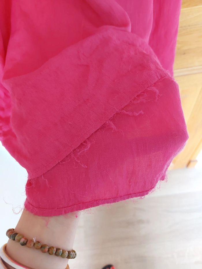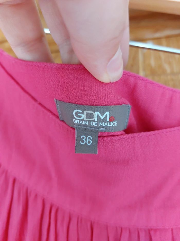 Jupe longue rose fushia Grain de malice,taille 36 Passants pour ceinture, fermeture sur le côté Non doublée En bon état ; défaut : le bas de la jupe est effilochée (voir photos) Longueur : environ 104cm