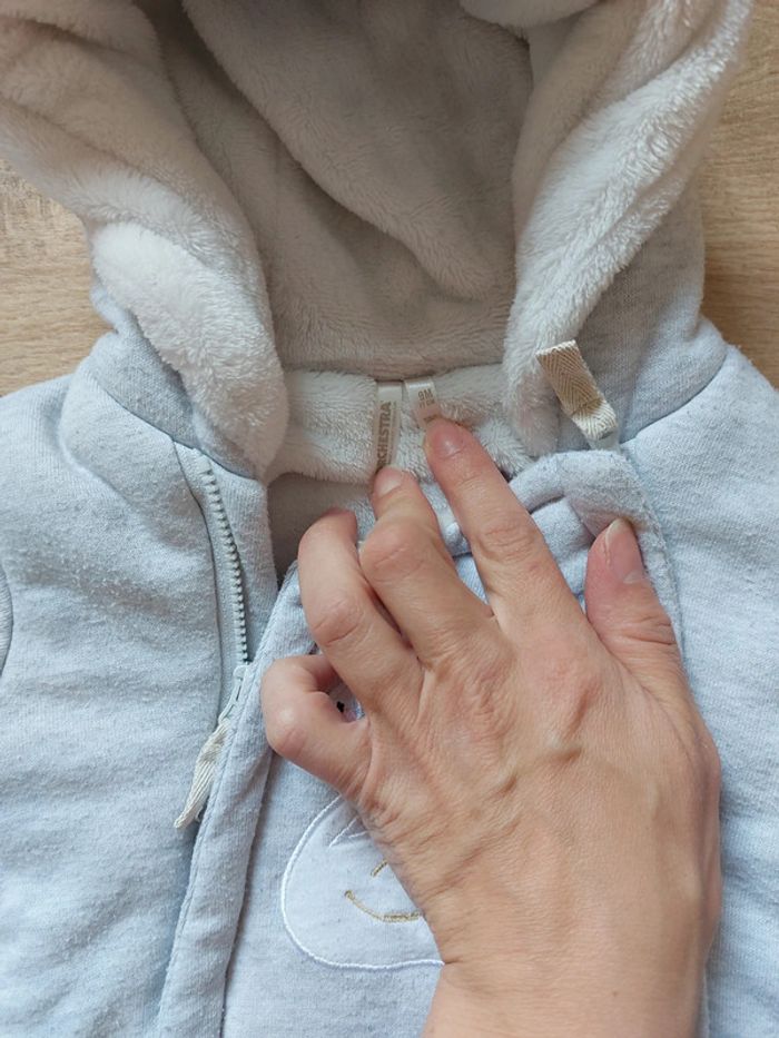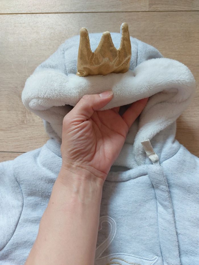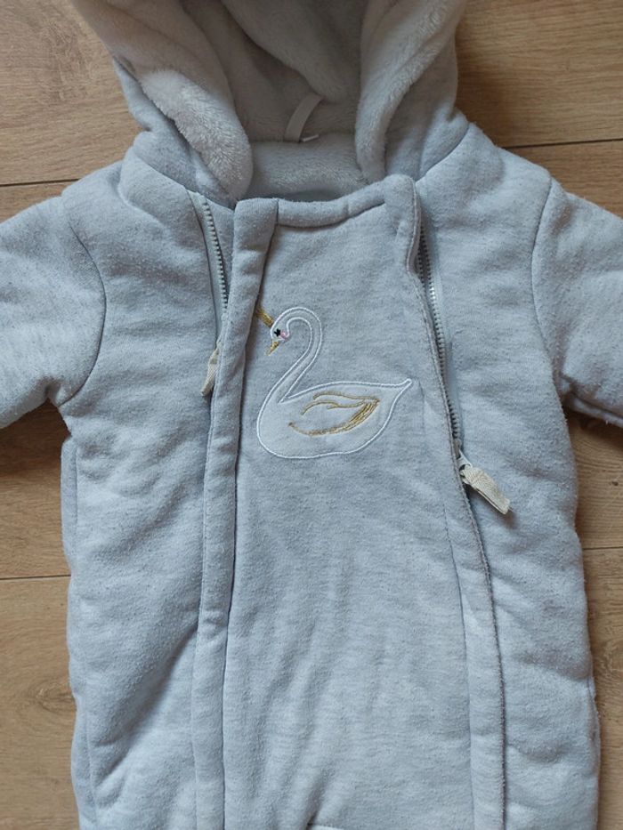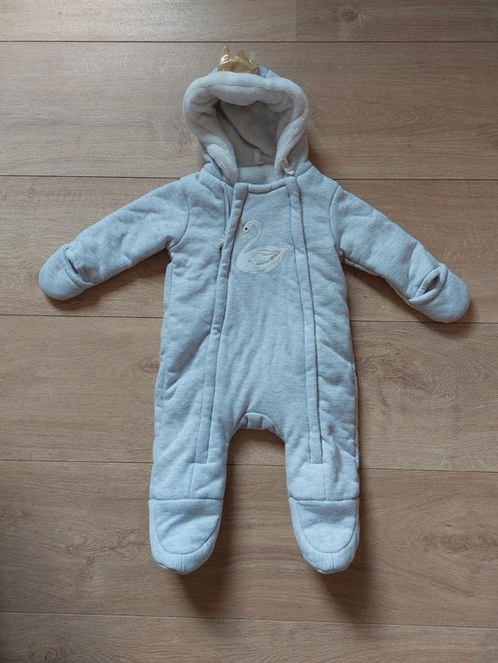Combi- pilote taille 9 mois Orchestra Ouverture double fermeture Intérieur fourré sauf les manches. Motif cygne avec couronne dorée sur la capuche. Etat satisfaisant : la combi a été portée un hiver et donc lavée plusieurs fois. La combi a été passée entièrement au rase-bouloche car beaucoup de bouloches suite aux lavages. + à prévoir éventuellement point de couture au pied gauche (voir photo 7), mais il n'y a pas de trous