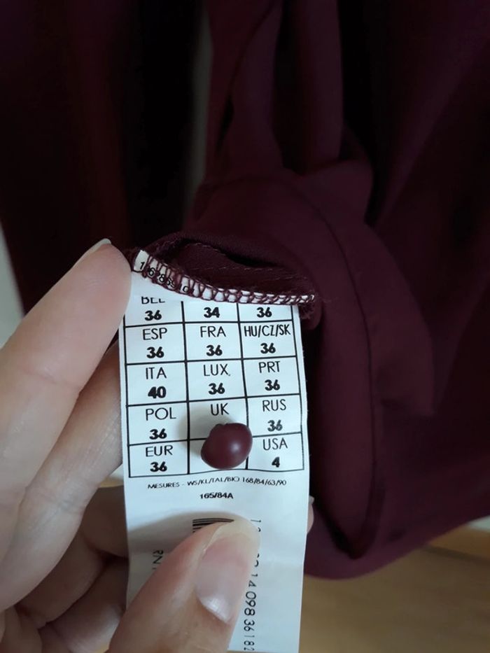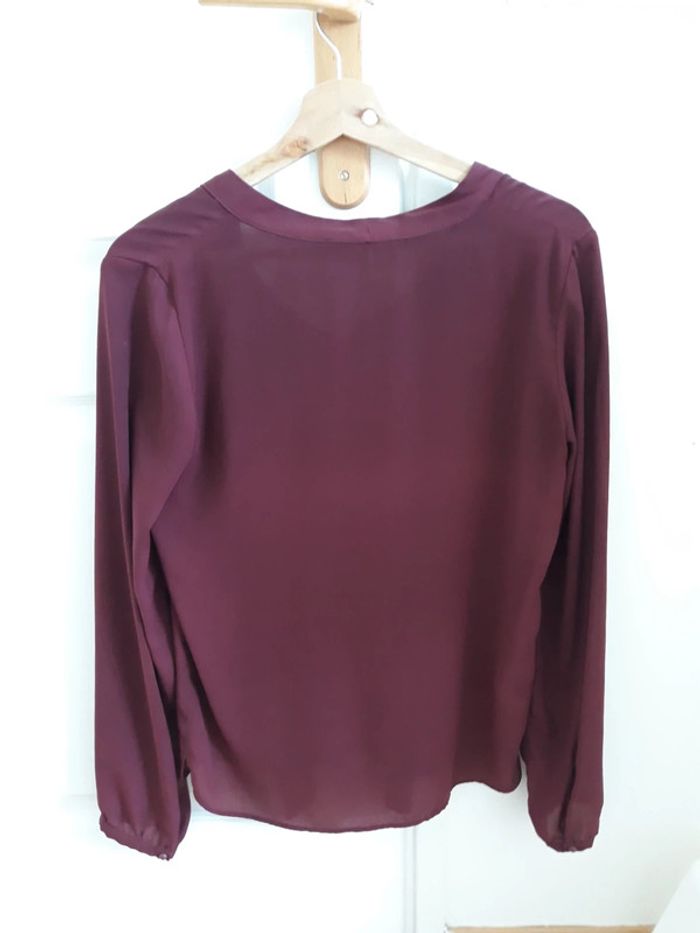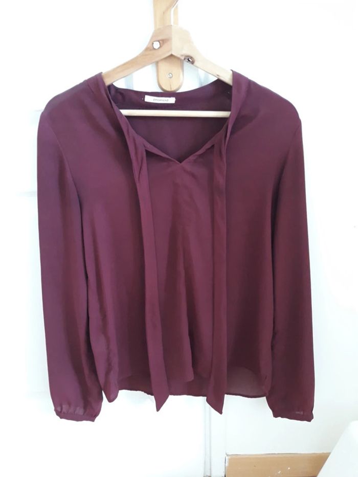 Jolie blouse Promod couleur lie de vin Taille 36 Col lavallière, à nouer Portée, en très bon état Matière : 100% polyester