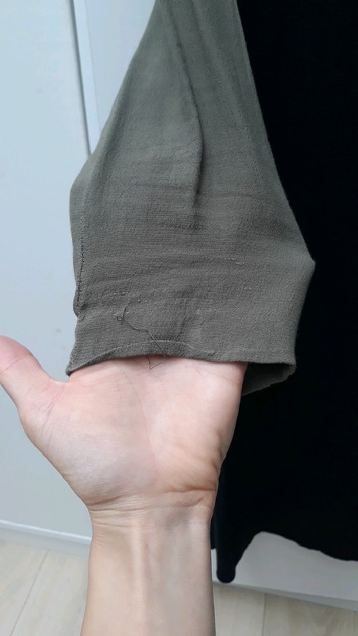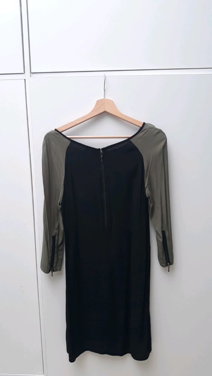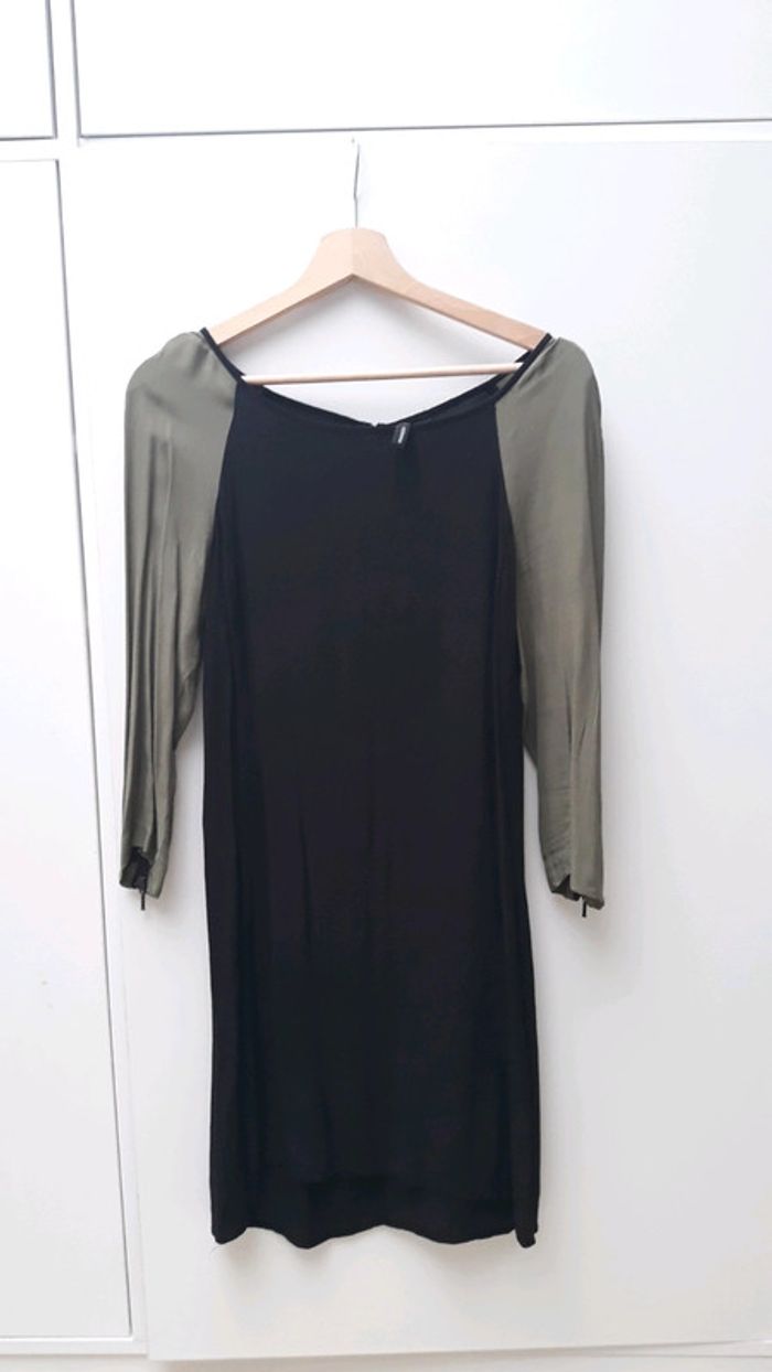 Jolie robe Mango Casual taille S Bicolore noire et manches kaki, manches 3/4 En bon état, ourlet à refaire au niveau de la manche gauche notamment. Fermeture par zip au dos + crochet, zip également aux manches. Matière : 100% viscose