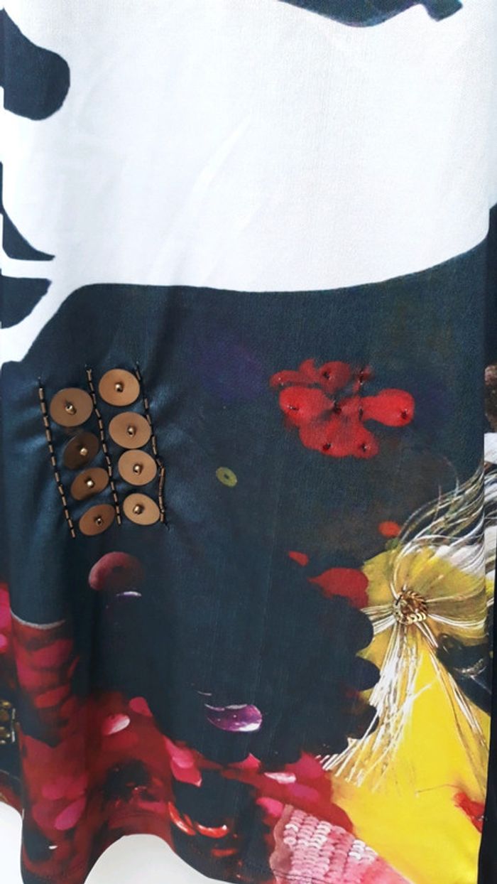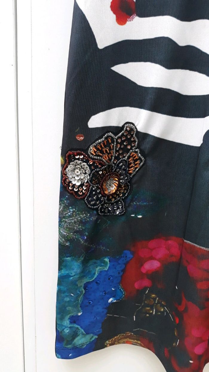 Robe Desigual modèle Face, taille S Décorée de perles et de sequins (manque quelques perles bleues en bas à droite voir photo 3, ne se remarque pas portée), très originale. Un petit sachet de sequins et perles de rechange est fourni avec. Portée 2/3 fois; elle est très bon état. Matière 100% polyester, lavage à la main. Longueur de la robe : 90cm
