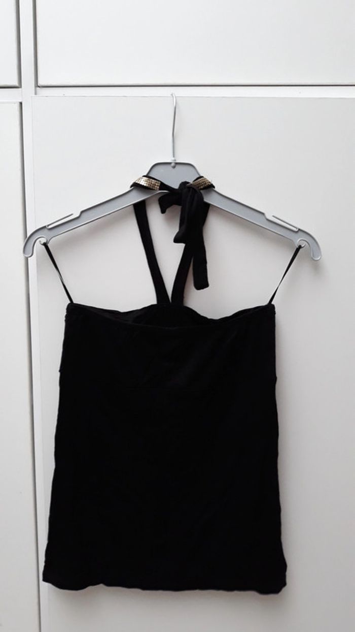 Top Camaïeu lien à nouer au cou, fronces niveau poitrine. Noir et pastilles dorées. Taille 1 Porté 1 fois, en très bon état Matière : 96% viscose, 4% elasthane