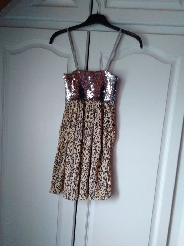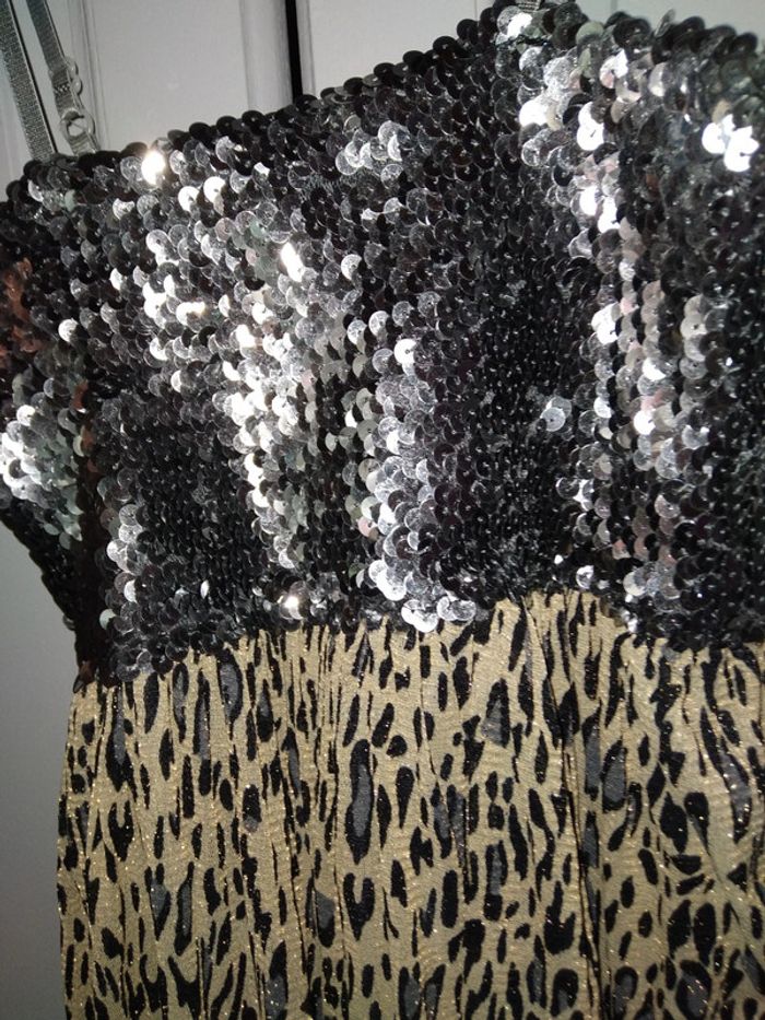 Bustier en piècement poitrine strass argenté tissu panthère il est doré tout doublé bretelles amovible pas de photo portée longueur sans les bretelles 61 cm largeur sous aisselle 31 cm pas de photo portée