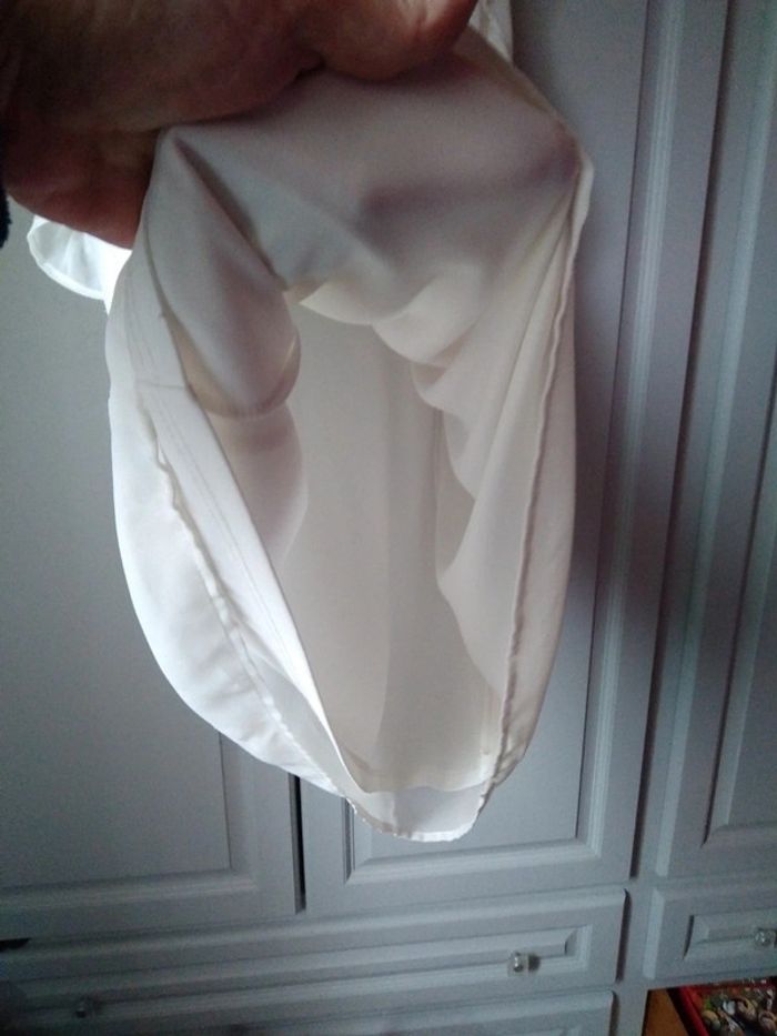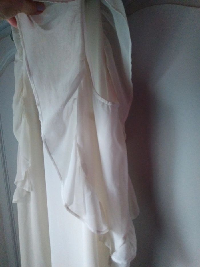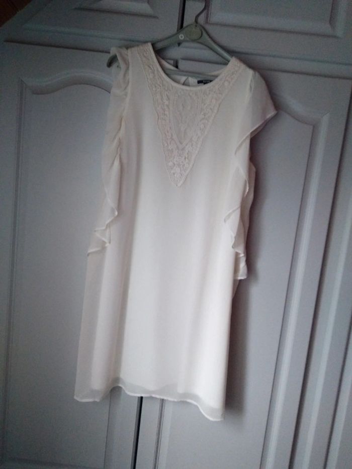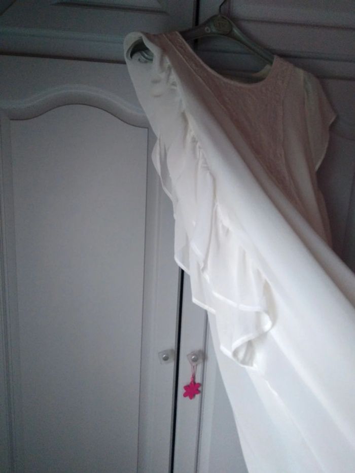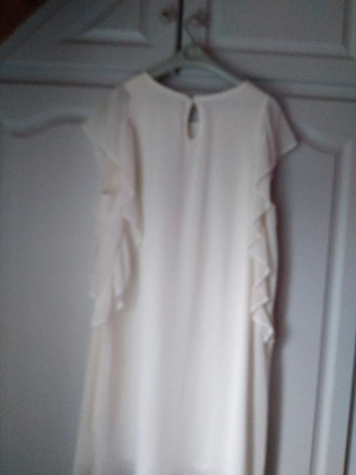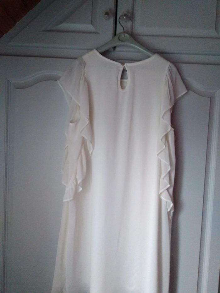 Bon jolie robe habillée s'attache derrière par un petit bouton volant fantaisie entièrement doublé volant original sur le côté des manches qui descend à plus de moitié de la robe étiquette marquée taille 46 mais combien plus à 44 pas de photo portée