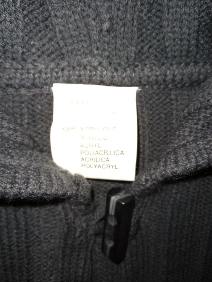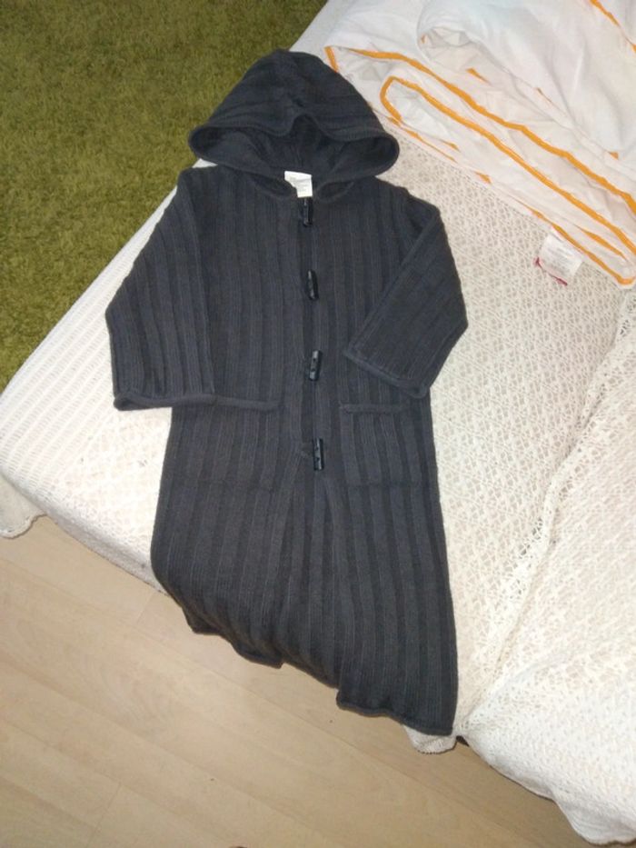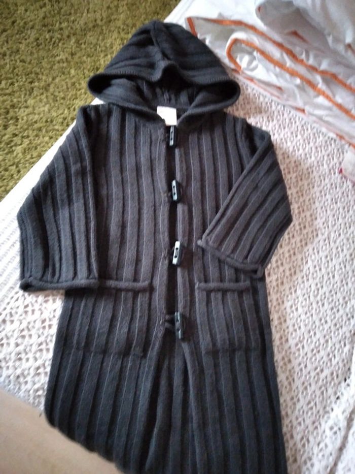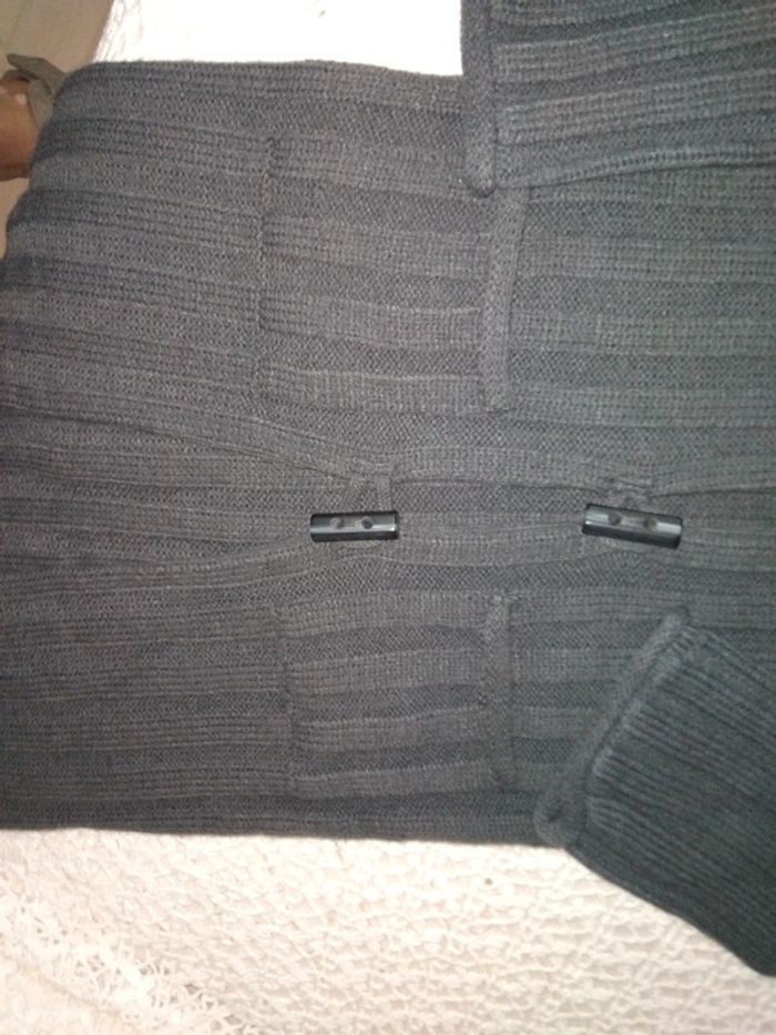 Vend gilet long avec capuche fixe manches longues deux petites poches plaquées quatre boutons plastique