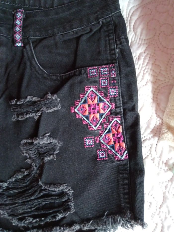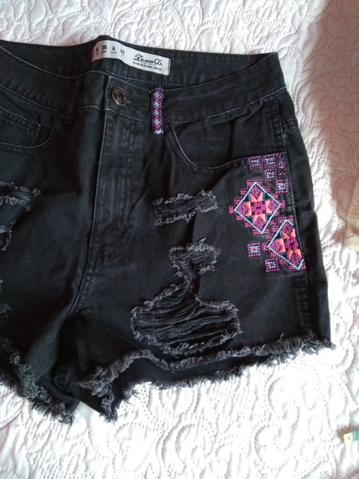 Vend joli short court brodé trois poches devant de derrière passant pour ceinture bouton métal longueur des jambes 32 cm pas de photo portée