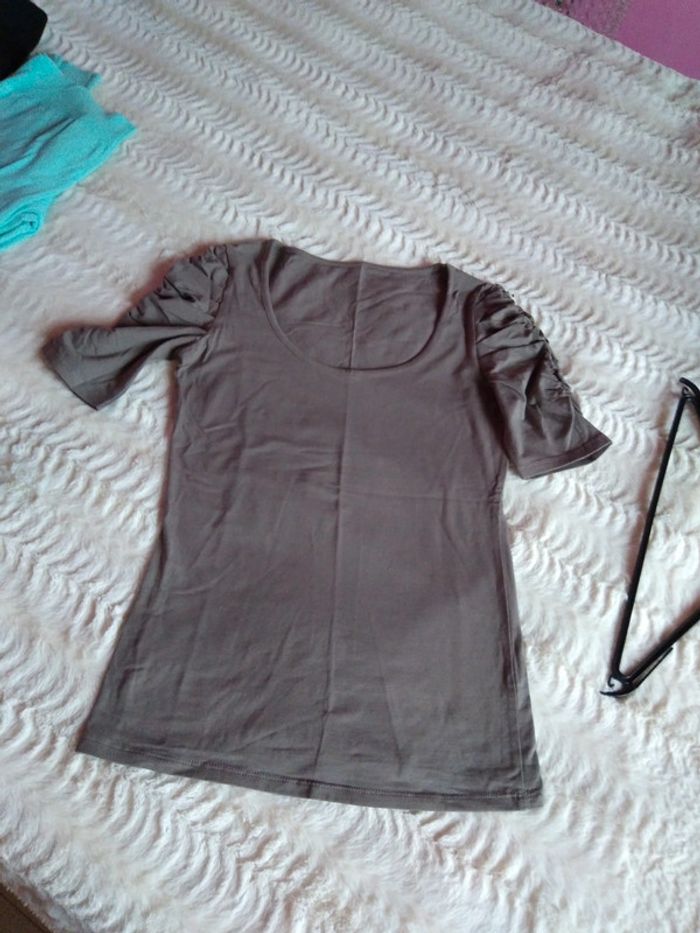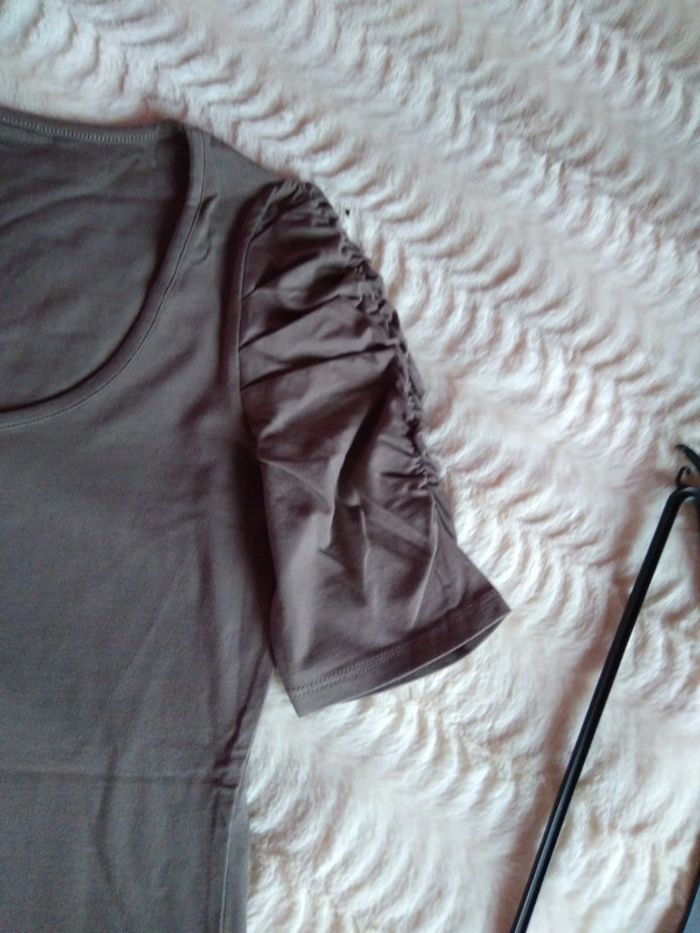 Vends t-shirt long couleur taupe message sur les bras encolure ronde longueur 62 cm largeur largeur sous aisselle 40 cm pas de photo portée
