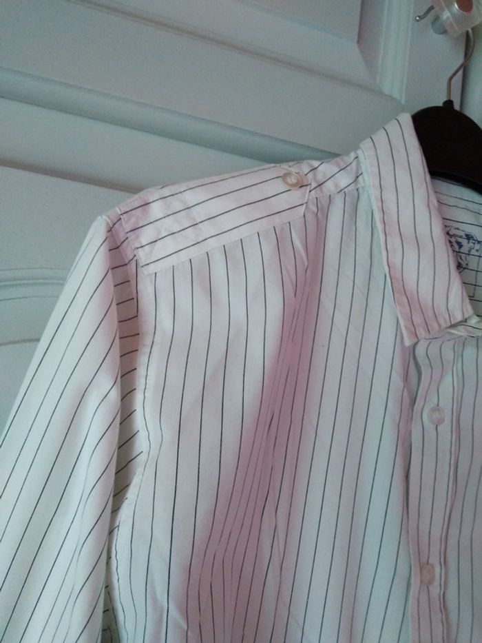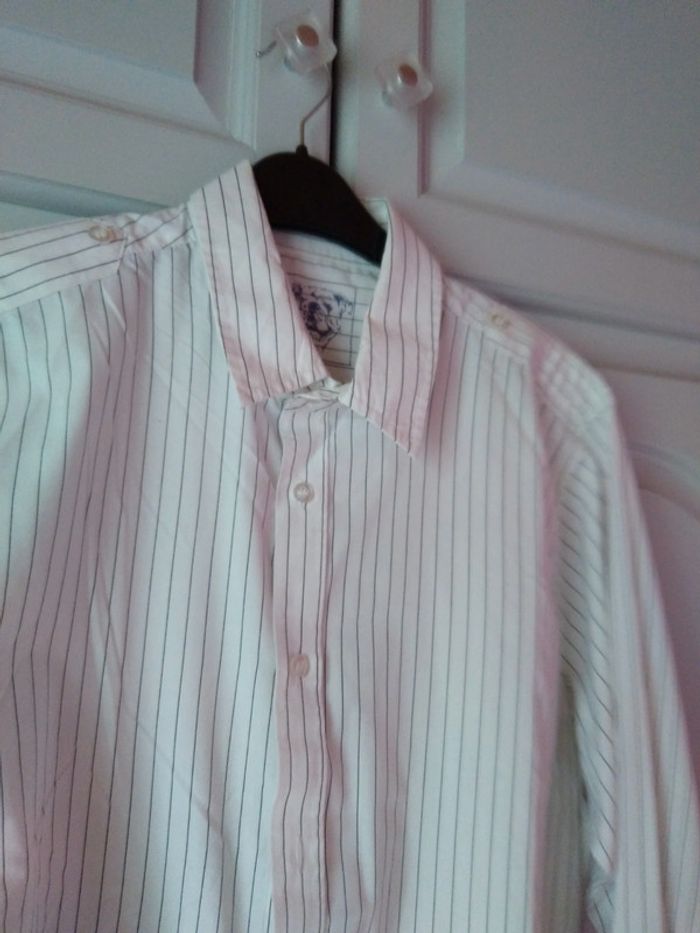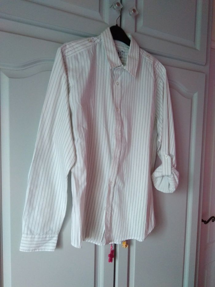 Vend chemise légère de bouton pour serrage au poignet 2 pattes épaule un bouton en plus en cas de perte chemise droite petites rayures légères couleur noire jamais mise