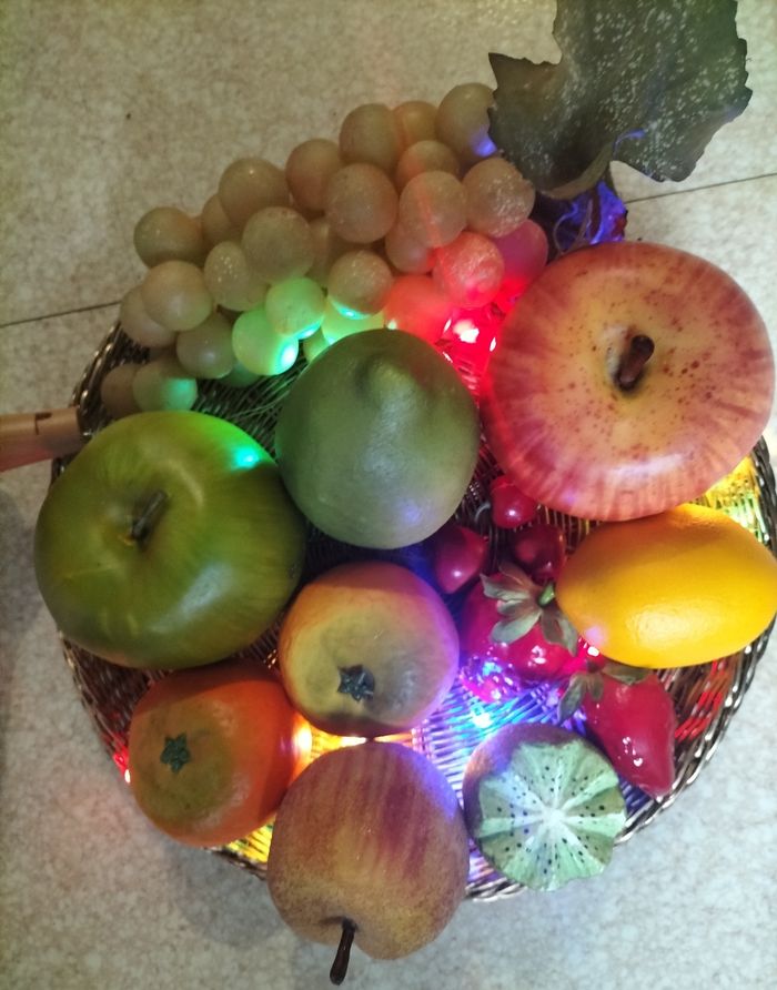 Panier de faux fruits Une jolie déco pour une table de Noël Un petit jeu de lumières ( non fourni ) donne un air de fête Le lot comprend : 1 panier osier couleur or 1 grappe de raisin 1 pomme rouge 1 kiwi 1 citron jaune 1 citron vert 2 clémentines 2 fraises 1 pomme verte Cerises Fruits état impeccable valant entre 0,99€ et 3€99 12€ le lot ferme donc aucune proposition ne sera accepter