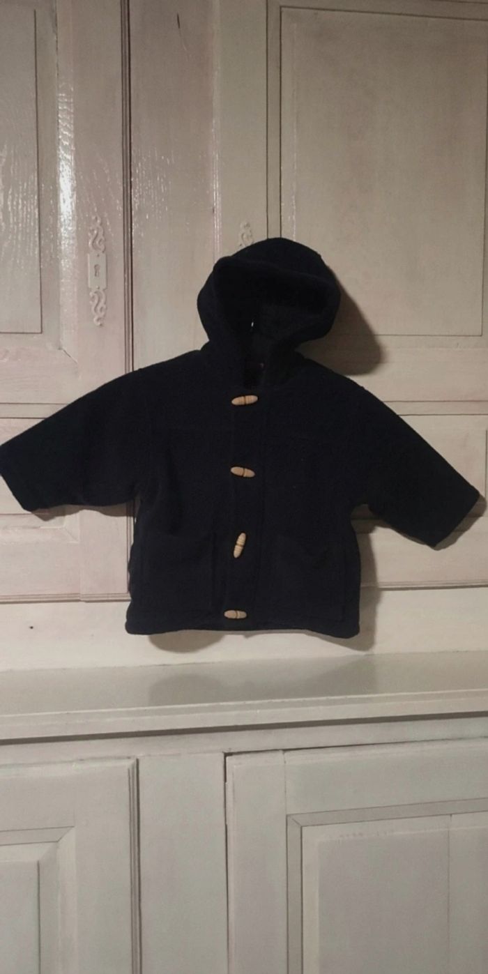 Manteau a capuche bleu marine fermeture et bouton. 12 mois