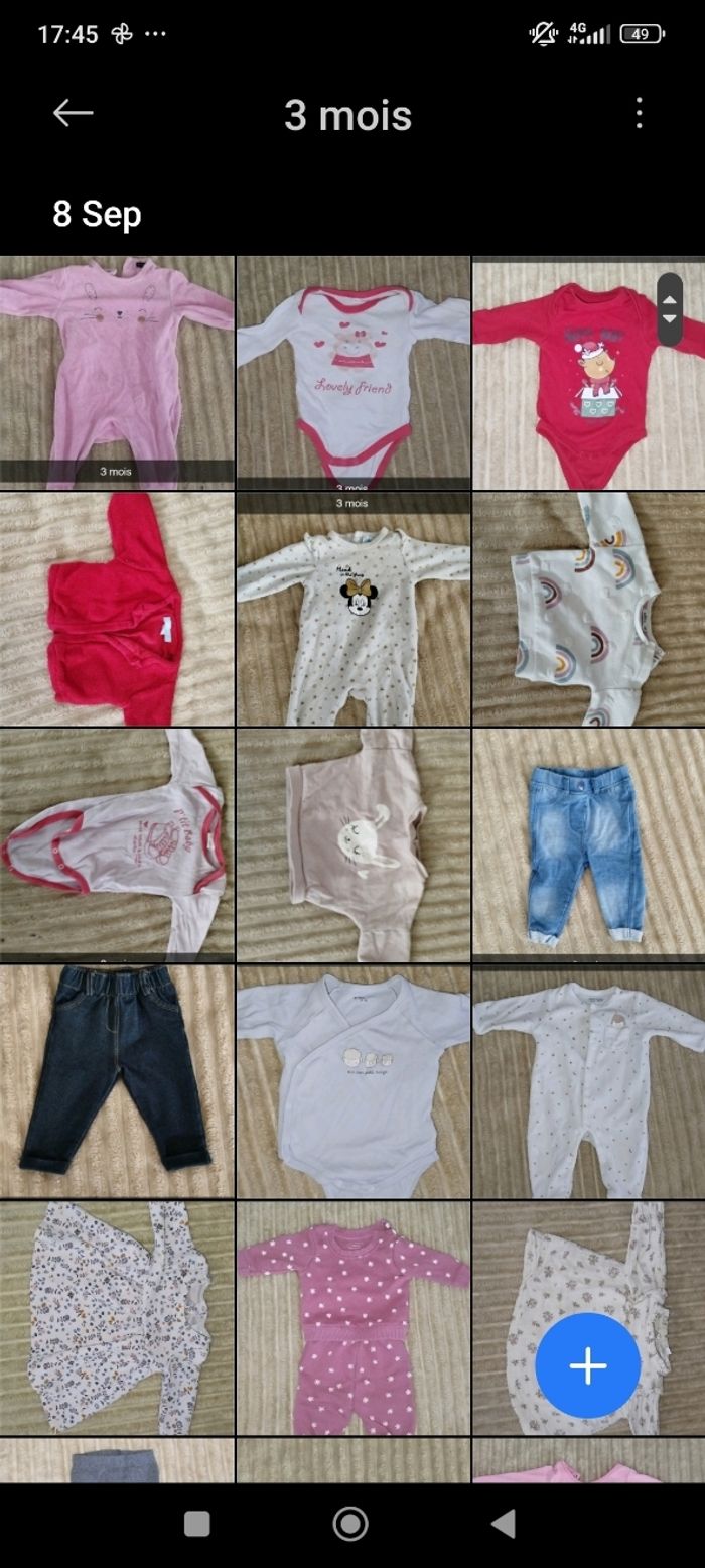 À vendre lot de 38 vetement en bon état taille 3 mois. À 20€ le lot ce qui équivaut à seulement 0.52 centimes pièces ! N'hésitez pas à faire un tour sur mes autres annonces je vends plein de vêtements bébé 😉