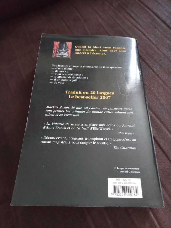 Livre "La Voleuse de livres" par Markus Zusak de 2007 527 pages de lecture Le livre est en bon état de lecture (la couverture est un peu salit et cornée par endroit, pages un peu jaunit par le temps, petite odeur et traces d'humidité)