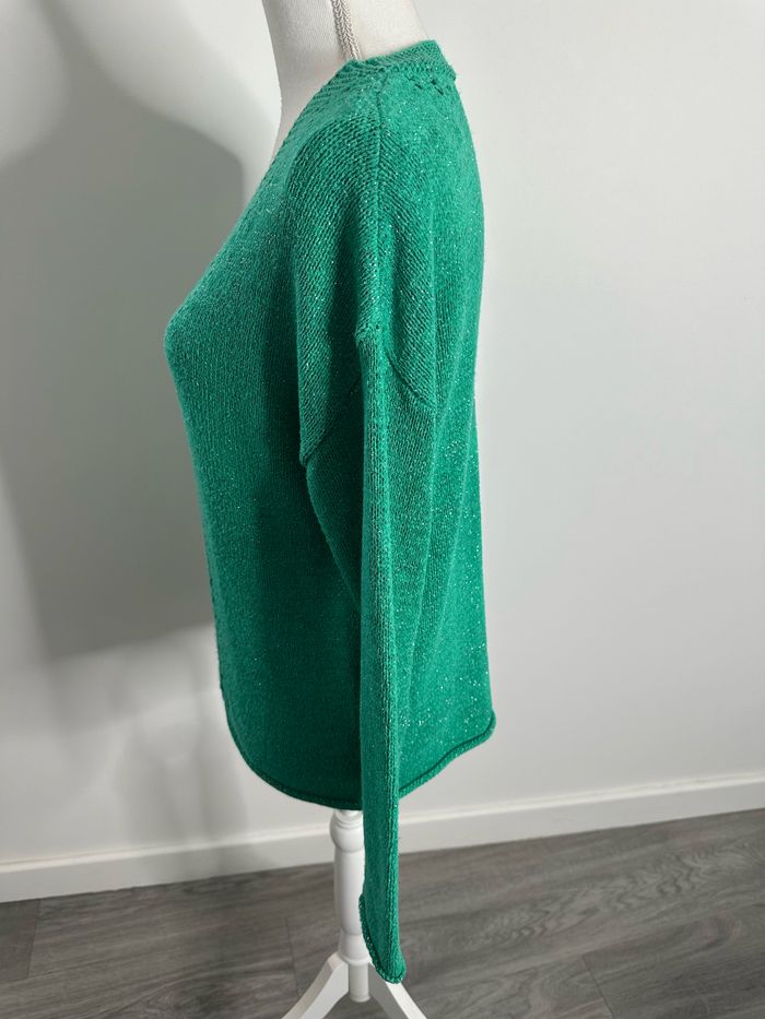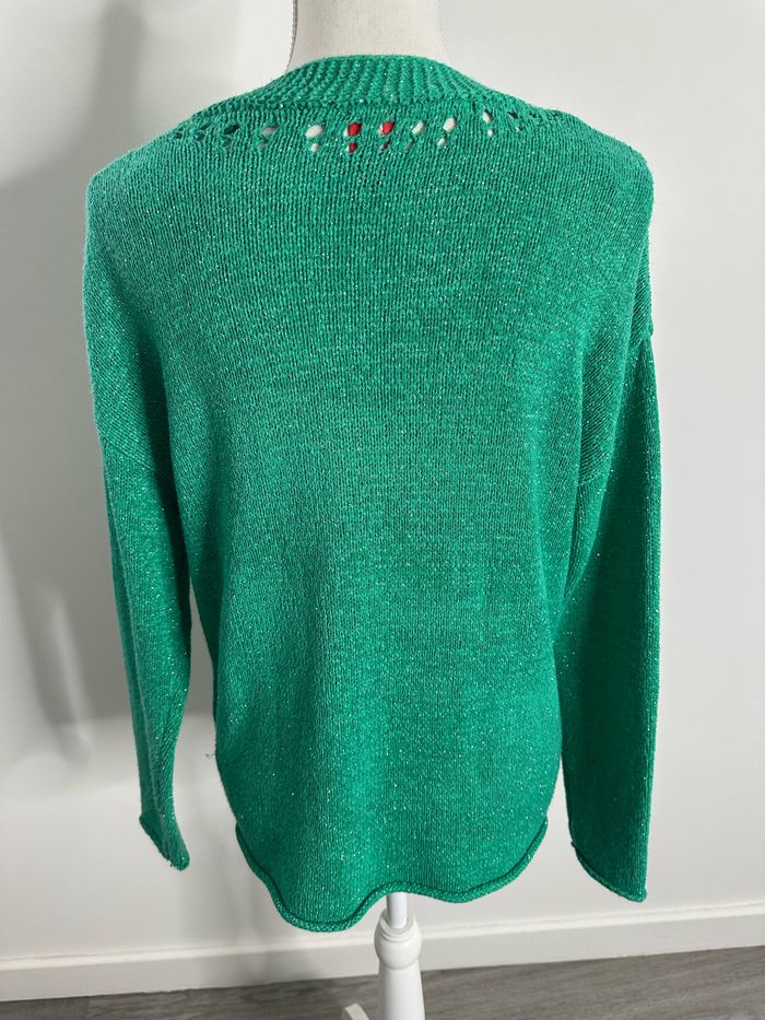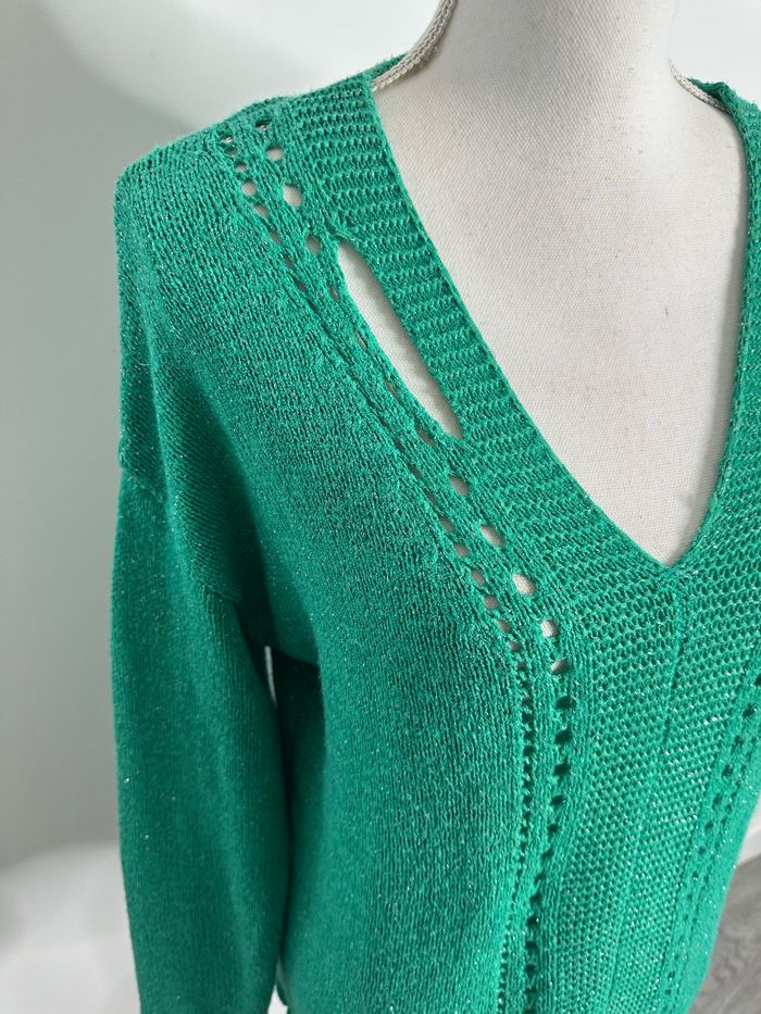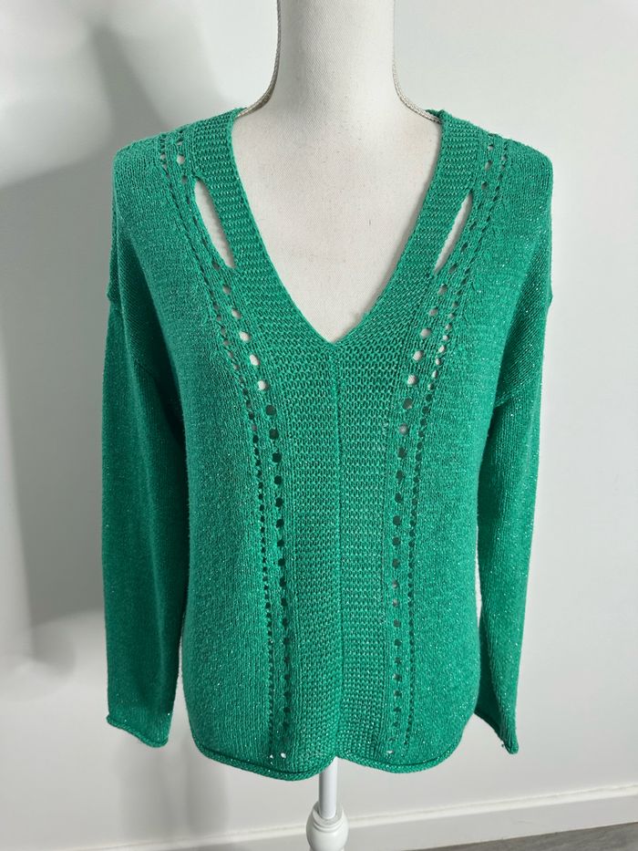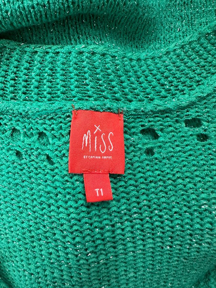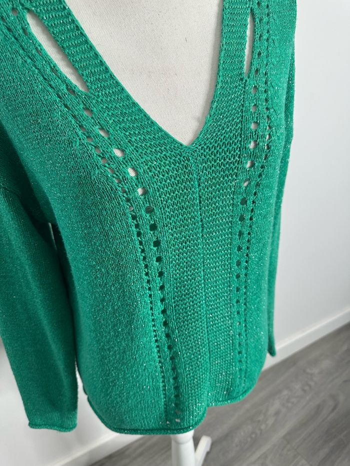 Pull - Excellent état - Taille 1 équivalent 36 S - Vert et argenté - Miss by Captain Tortue - Maille ajourée - Col en V - Acrylique, nylon, polyester, fibre métallisée Dimensions: - 60cm niveau aisselles - 65cm de long