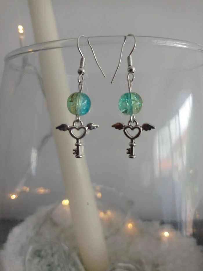 Boucles d'oreilles clés avec des ailes et perles de verre