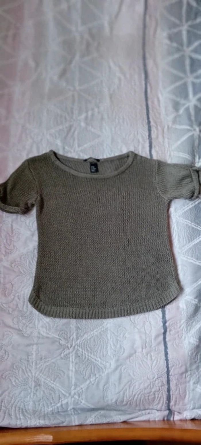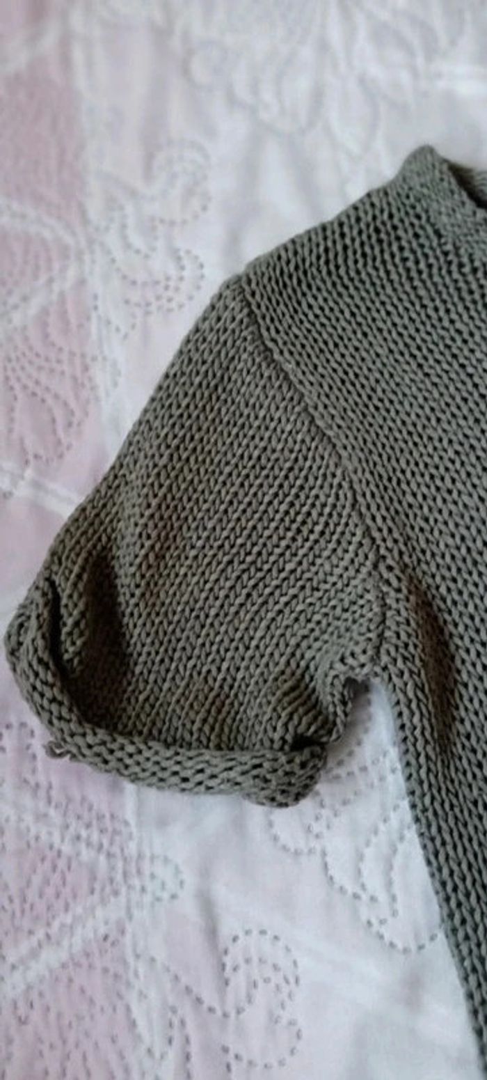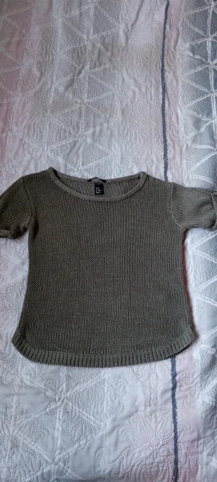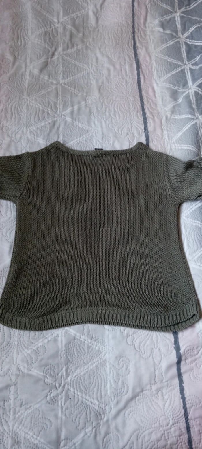 Pull manches courtes avec revers maille fine un peu ajourée idéal porté au dessus d une chemise longueur 49 cm devant 51 cm derrière largeur aisselles à aisselles 42 cm largeur épaules 40 cm peu porté en bon état ⚠️ un petit trou au niveau du revers d une manche qui nécessite un point de couture #midole #midolefemme #midolefemmexs #pullfemme34 #pullfemmexs #pullmanchescourtes #pullmaillefine #h&m #kaki