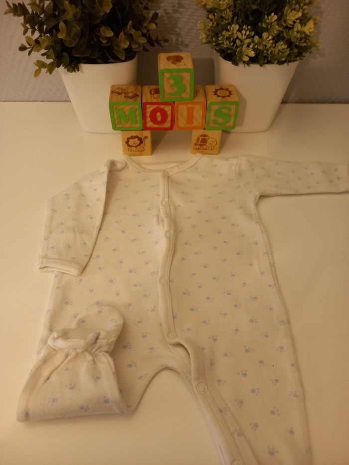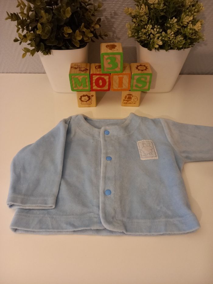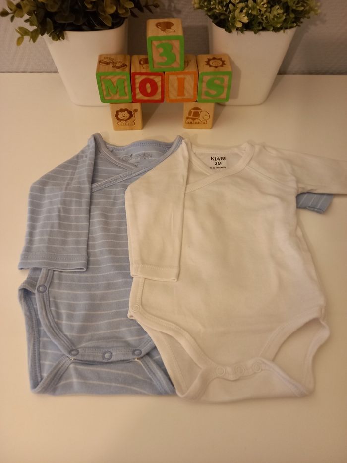 Lot d'un pyjama fin blanc avec une veste de pyjama chaude bleu clair, de la marque King bear, avec deux bodies manches longues blanc (kiabi) et bleu à rayures blanches (baby by gemo), en très bon état, taille 3 mois.
