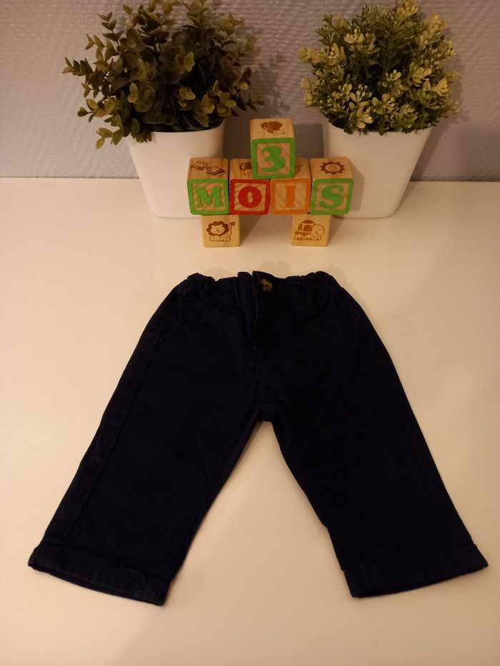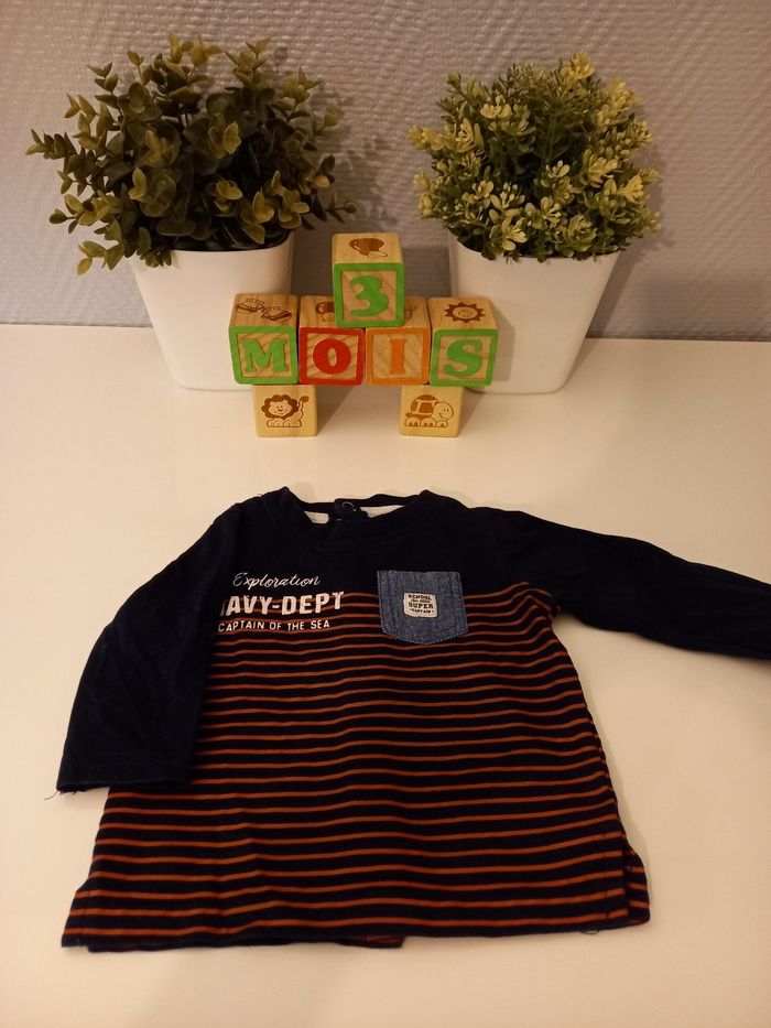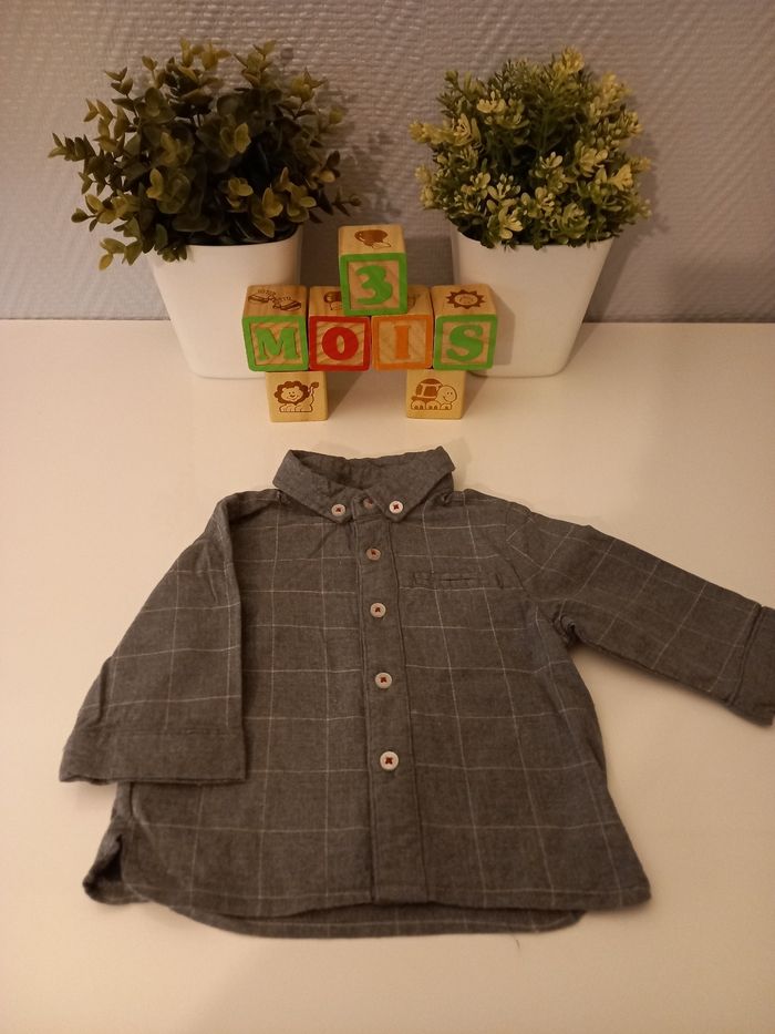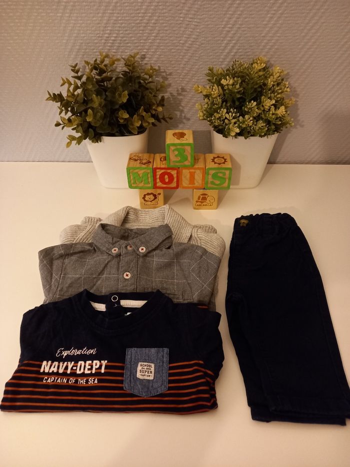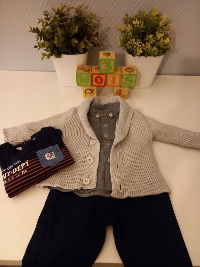 Tenue complète composé de : Un pantalon bleu marine de la marque kiabi, un t-shirt manches longues bleu marine de la marque baby by gémo, une chemise manches longues, grise, de la marque kiabi et un gilet en épais, gris clair, de la marque tex baby. Le tout en très bon état, taille 3 mois.