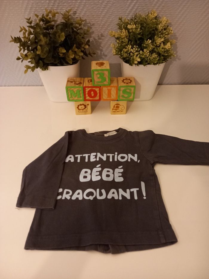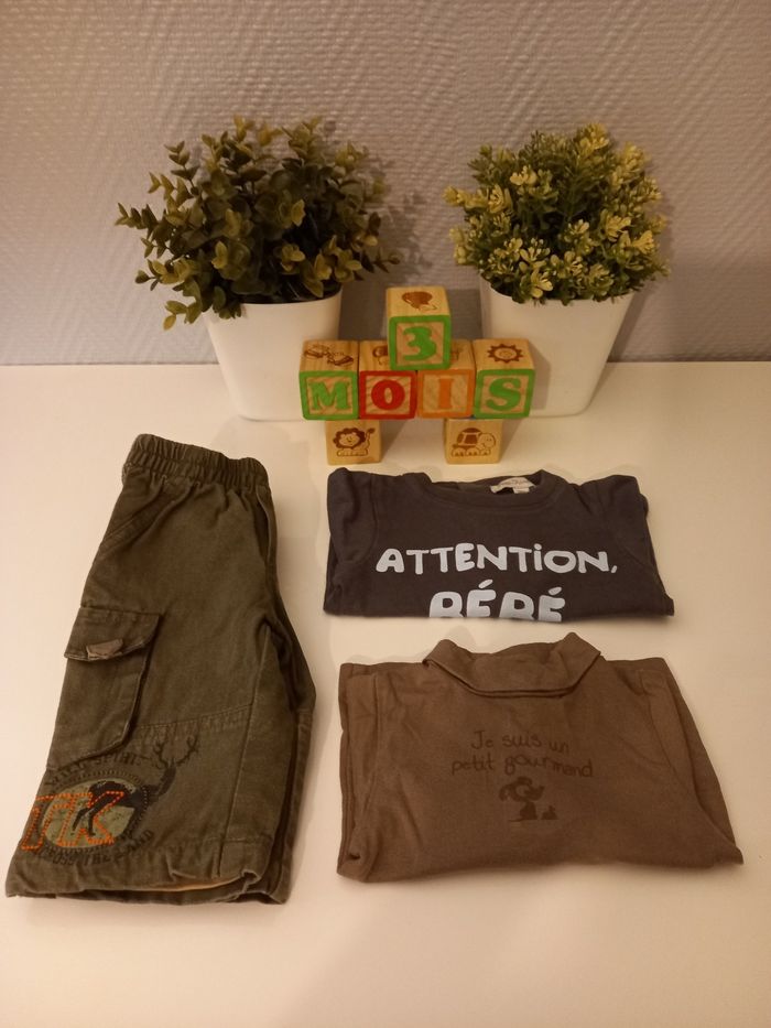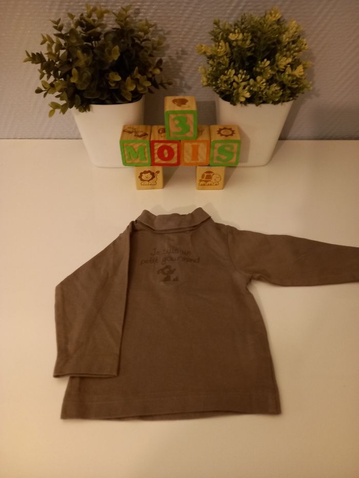Tenue complète composée de : Un pantalon kaki doublé, un t-shirt manches longues, petit kimbaloo, gris et un t-shirt manches longues à col roulé marron clair, de la marque tout compte fait. Le tout en très bon état, taille 3 mois.