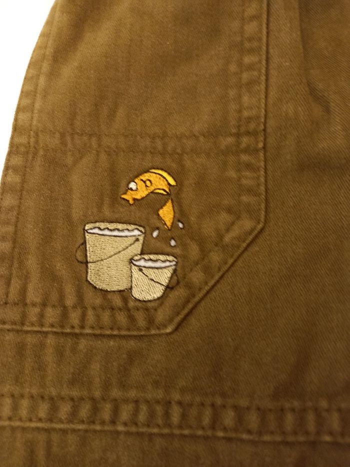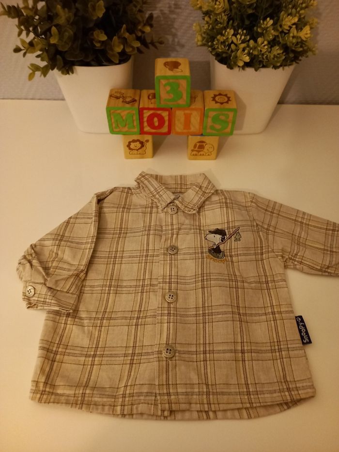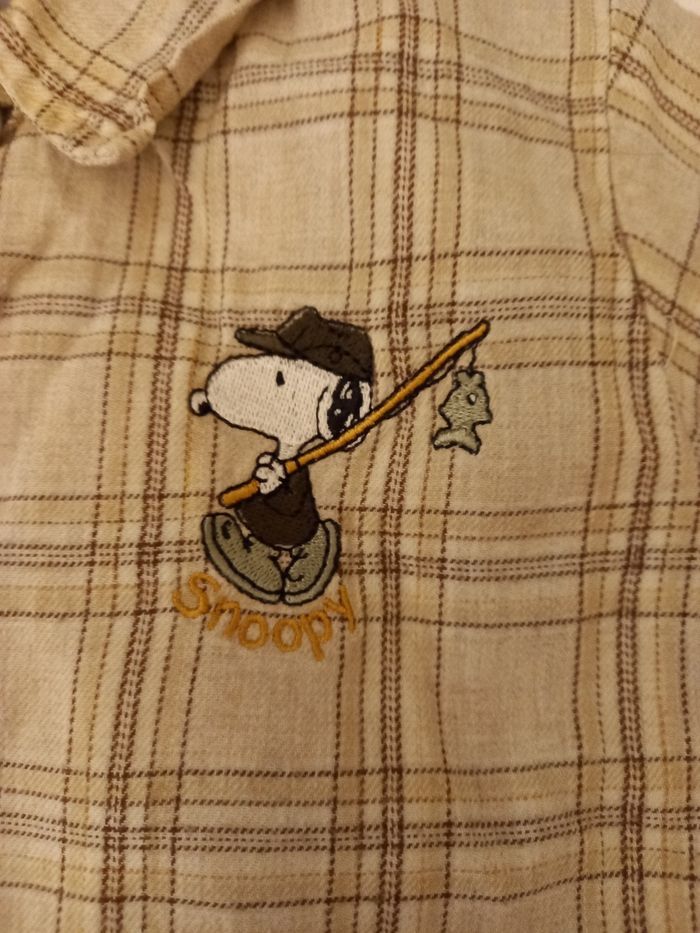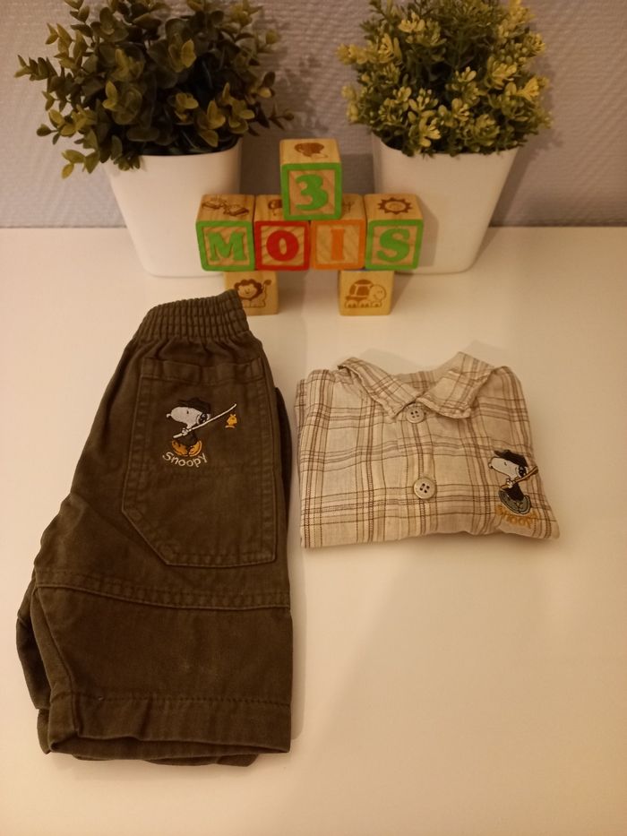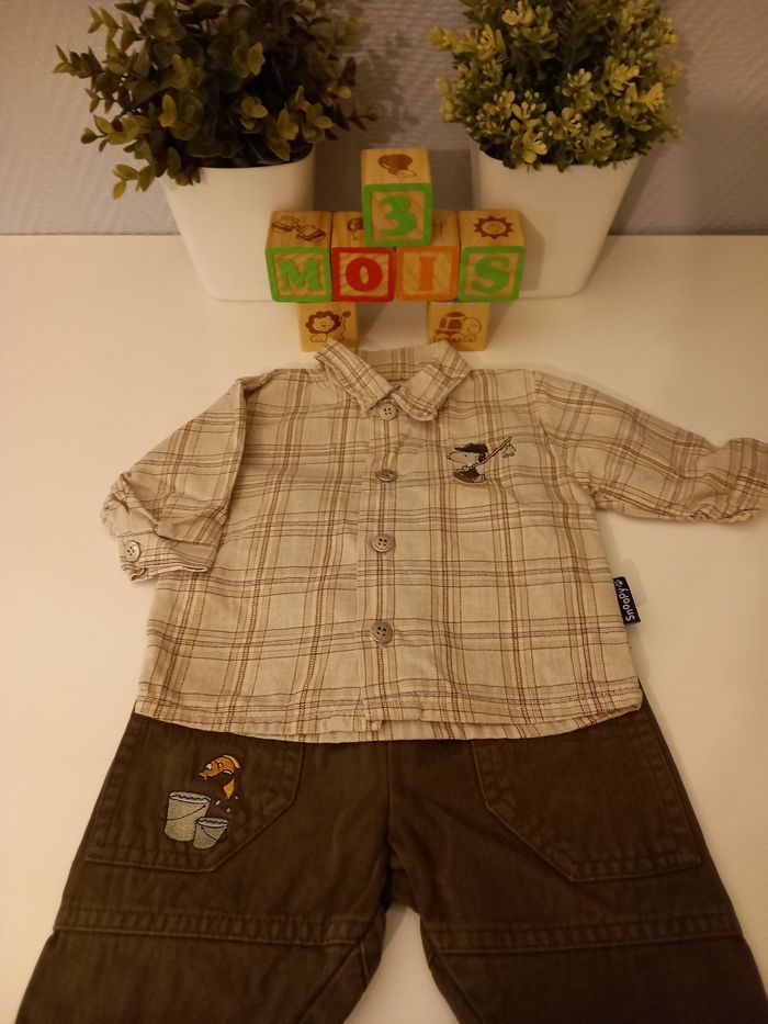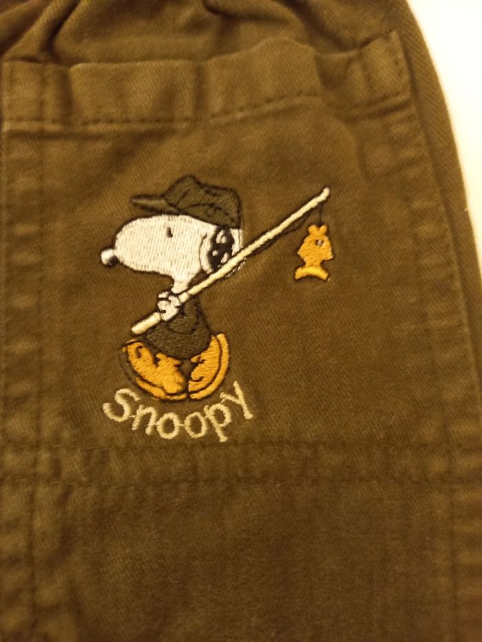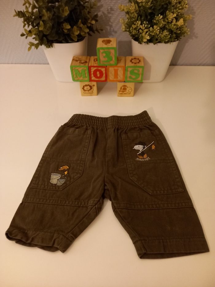 Taille 3 mois, pantalon kaki, broderie snoopy, très bon état.