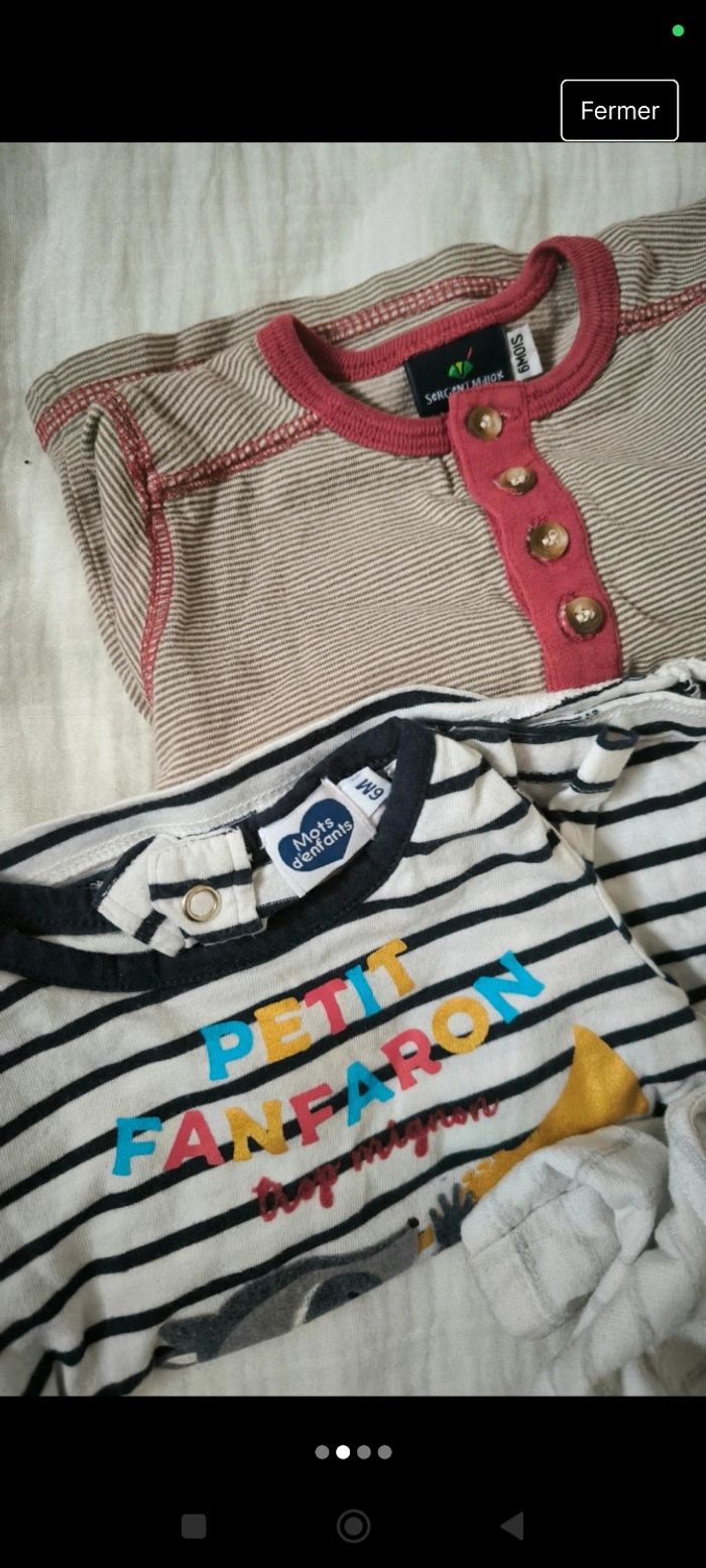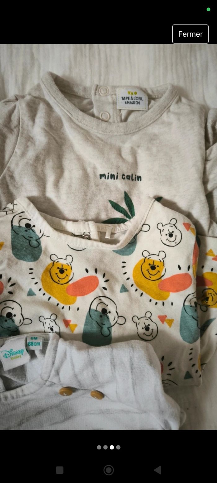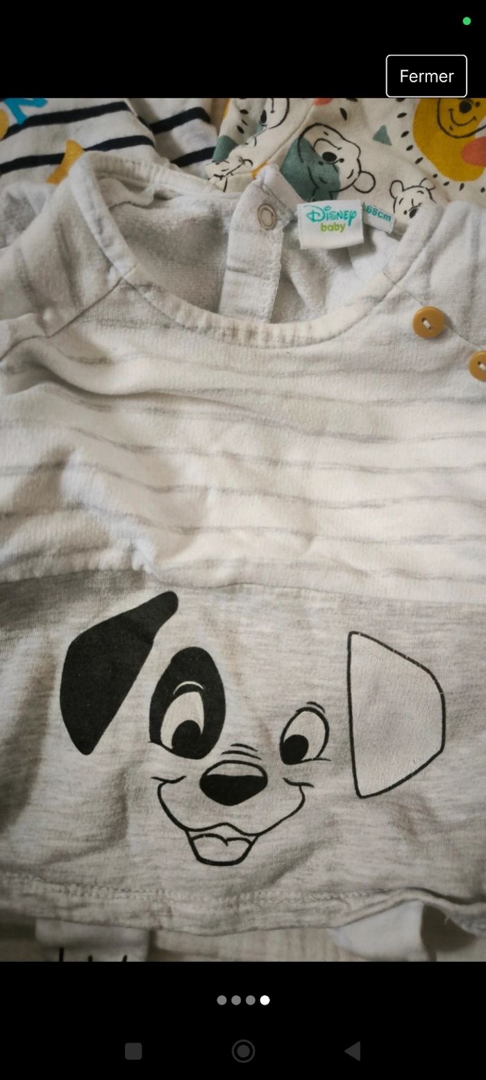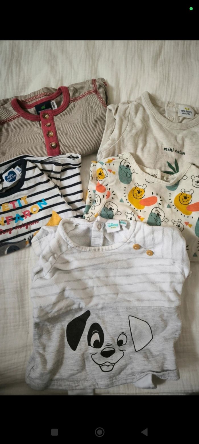 Lot de 5 t-shirts manches longues 6 mois 2 Disney (Winnie l'ourson & 101 dalmatiens) 1 mots d'enfants 1 sergent major 1 tape à l'oeil