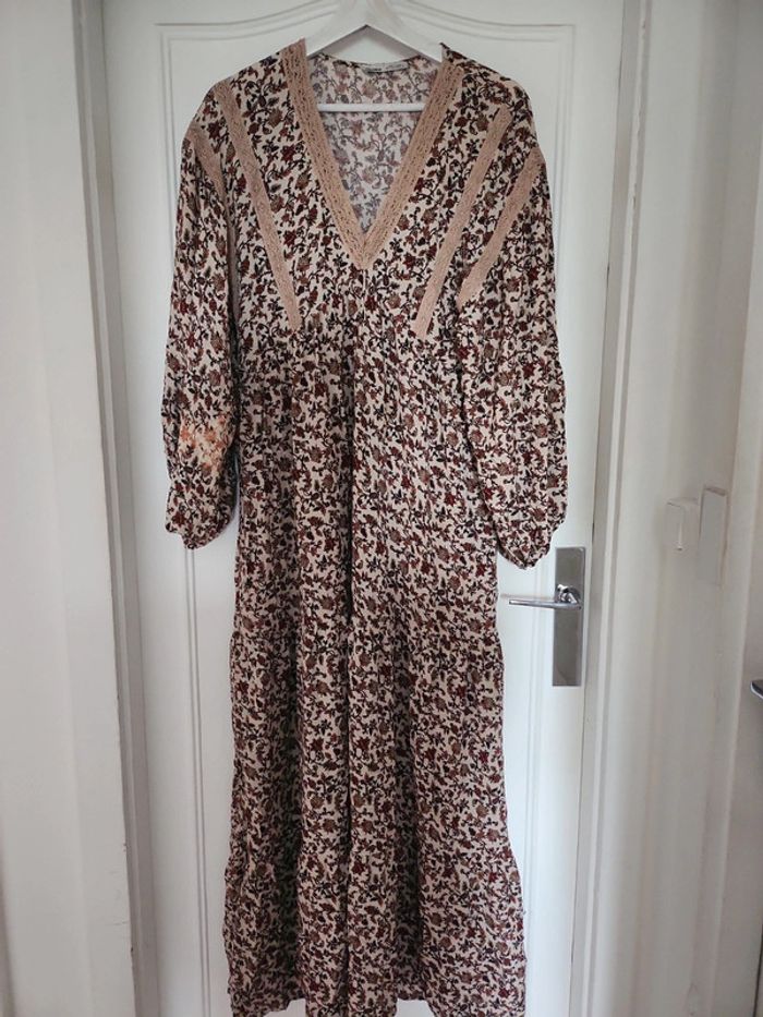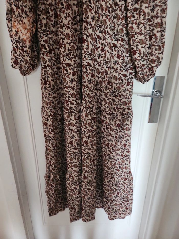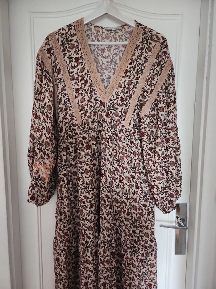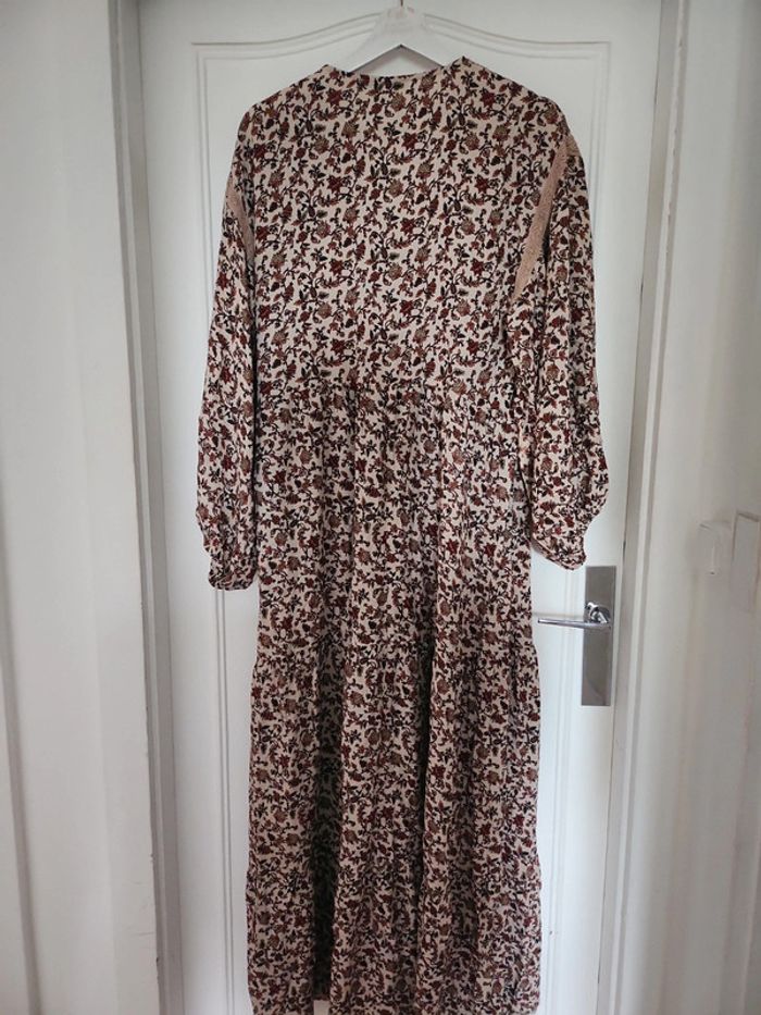Robe longue taille S qui équivaut à un 38 très bonne état voir neuve à part tachée sue la manche voir photo 3 d'où son prix