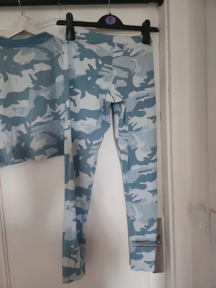 Ensemble haut court et legging taille S 36 le bas et 42 le haut qui correspond plus a un 40 très bonne état voir neuf petit sur le derrière du legging doux son prix voir photo 6