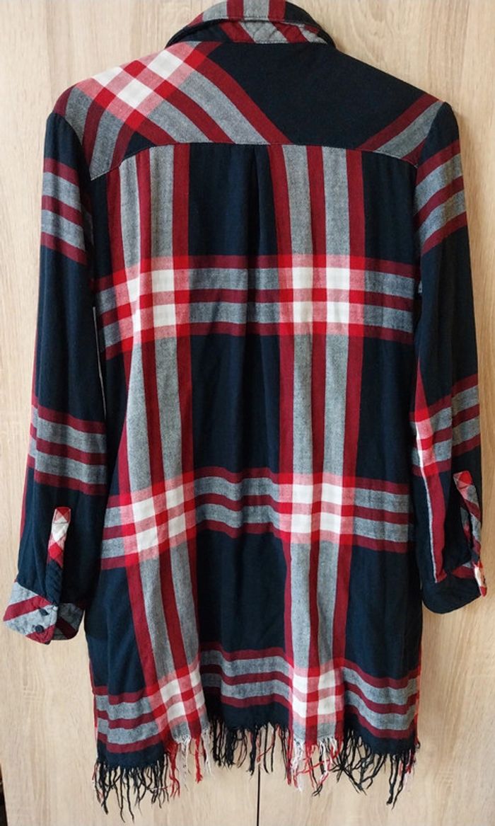 Chemise longue Zara taille S marine,rouge et grise à carreaux À franges Boutonnière à l'avant et sur la poitrine Poches latérales Longueur 90 cms environ Certaines franges ne sont pas de la même longueur mais ce n'est pas choquant Manque étiquette de composition #gwen89350taille36