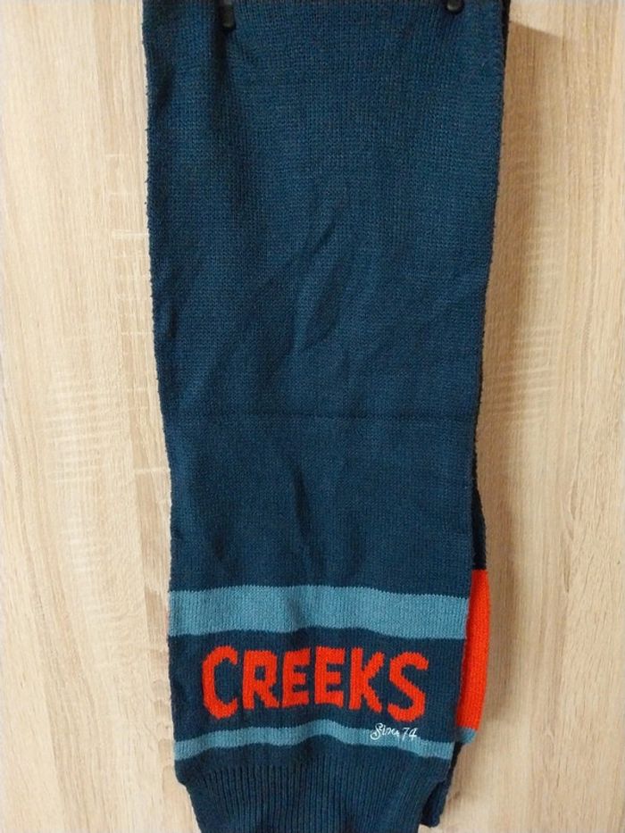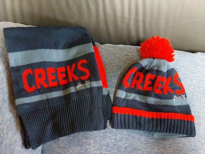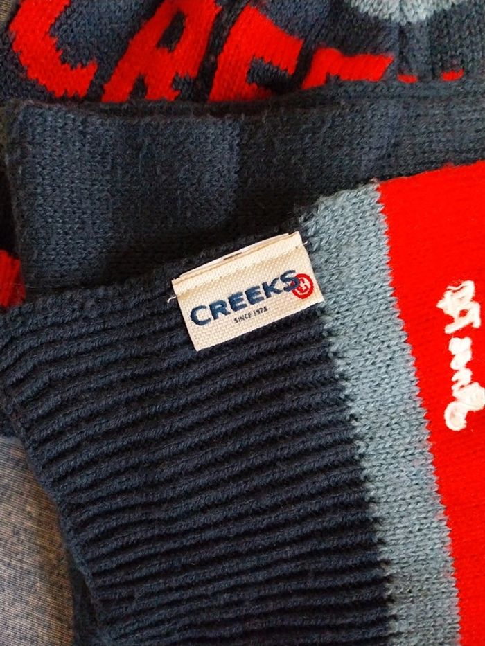 Ensemble bonnet/écharpe Creeks marine et rouge Bonnet 23 cms de large Écharpe 130 cms de long Prénom sur l'étiquette Bien porté mais bon état #gwen89350taille10ans