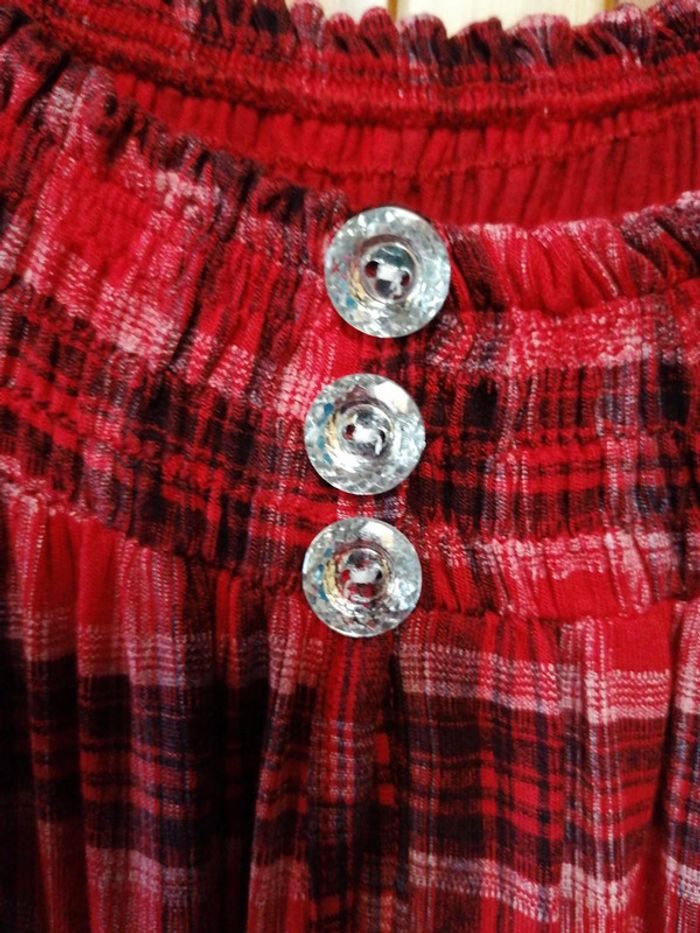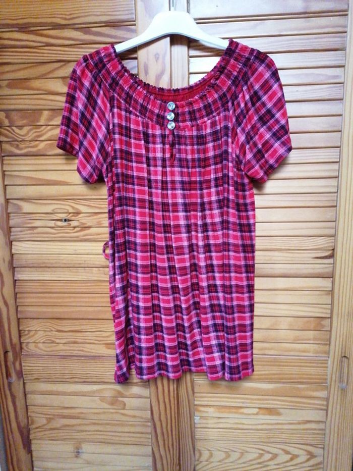 Top fluide taille 5 (44/46) rouge à carreaux Élastiqué aux épaules pour le porter épaules dénudées Petite fente et bouton brillant sur le devant Manque la petite ceinture mais se porte très bien comme ça #gwen89350taille46 #gwen89350taille44