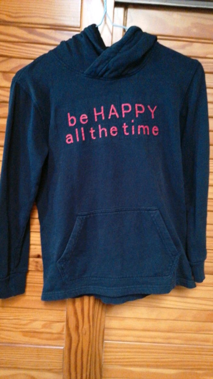 Sweat à capuche Gémo taille 10 ans marine et écriture rouge... Poche kangourou... Bien porté mais bon état... Écriture légèrement fendue mais se voit très peu #gwen89350taille10ans
