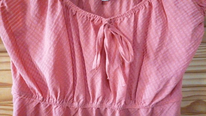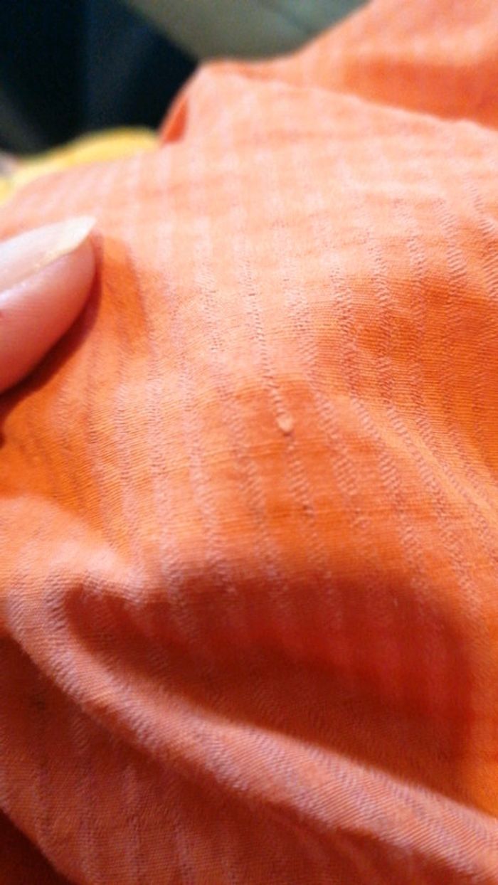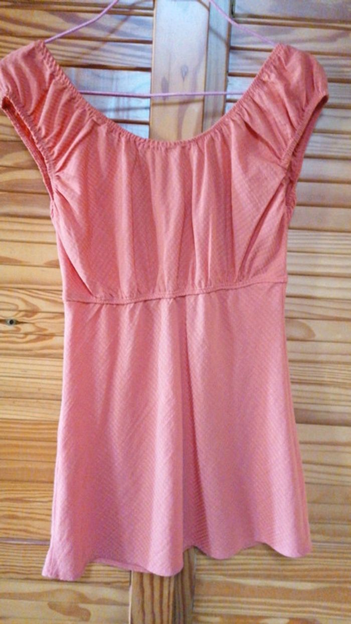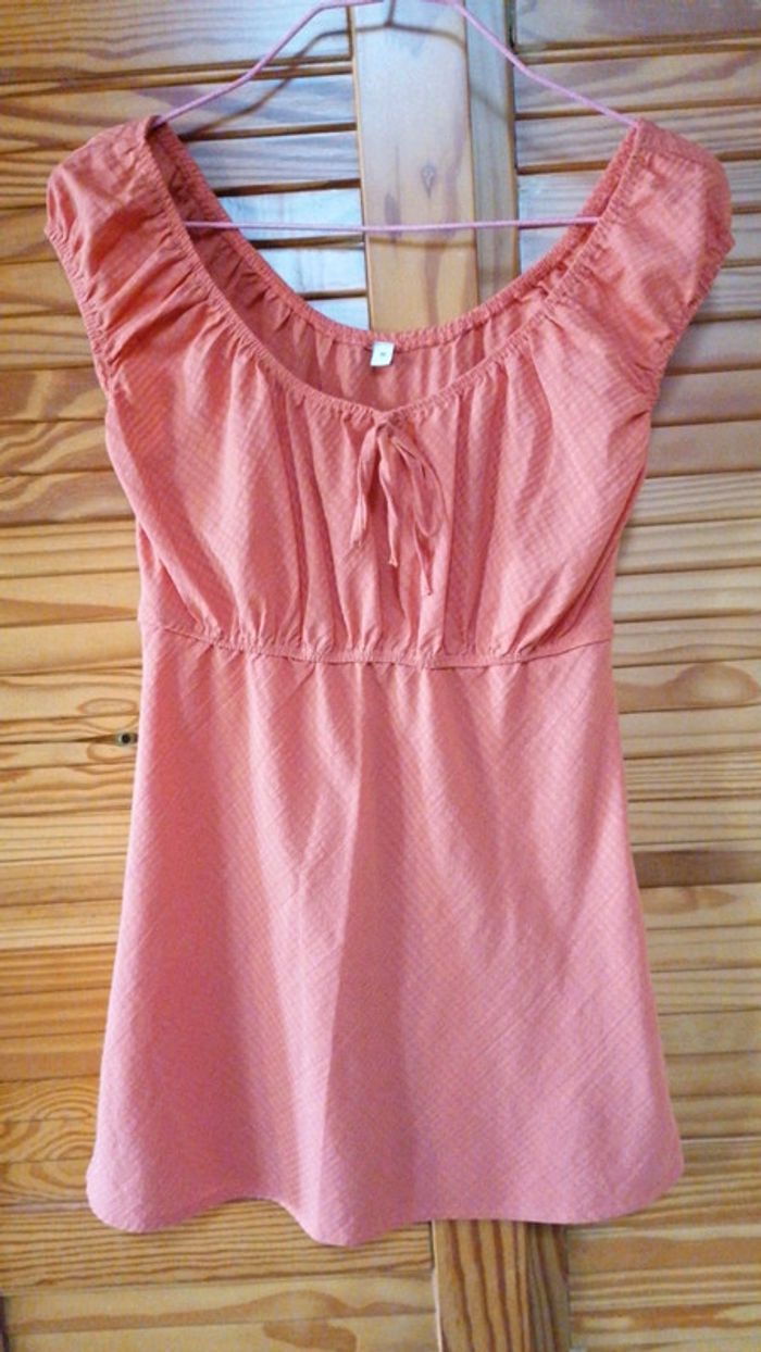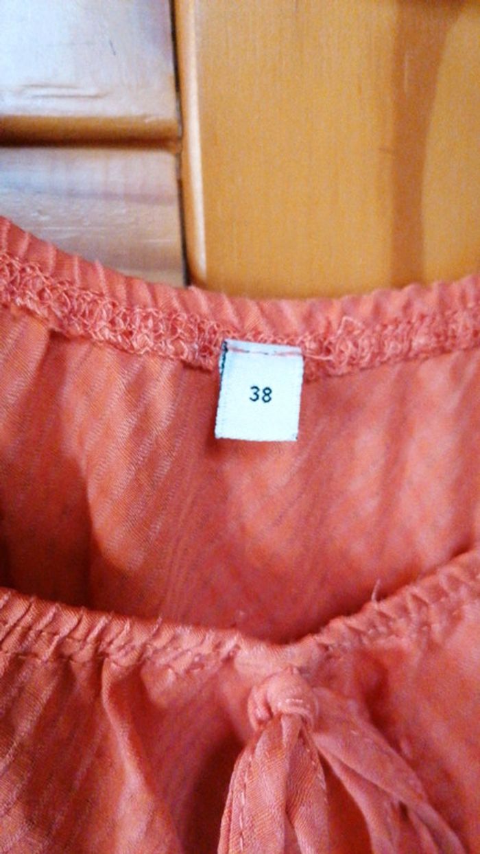 Top taille 38 orange avec petit nœud au décolleté... Élastiqué sous la poitrine, au col et aux manches... Déjà bien porté, présente quelques défauts de fils qui ne se voit quasiment pas #gwen89350taille38