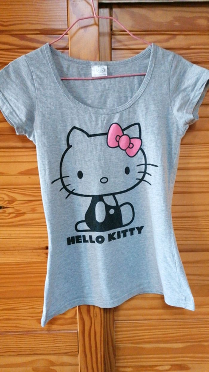 Tee shirt Hello kitty taille 36/38 gris chiné, noir et rose... Bien porté mais reste en bon état #gwen89350taille38