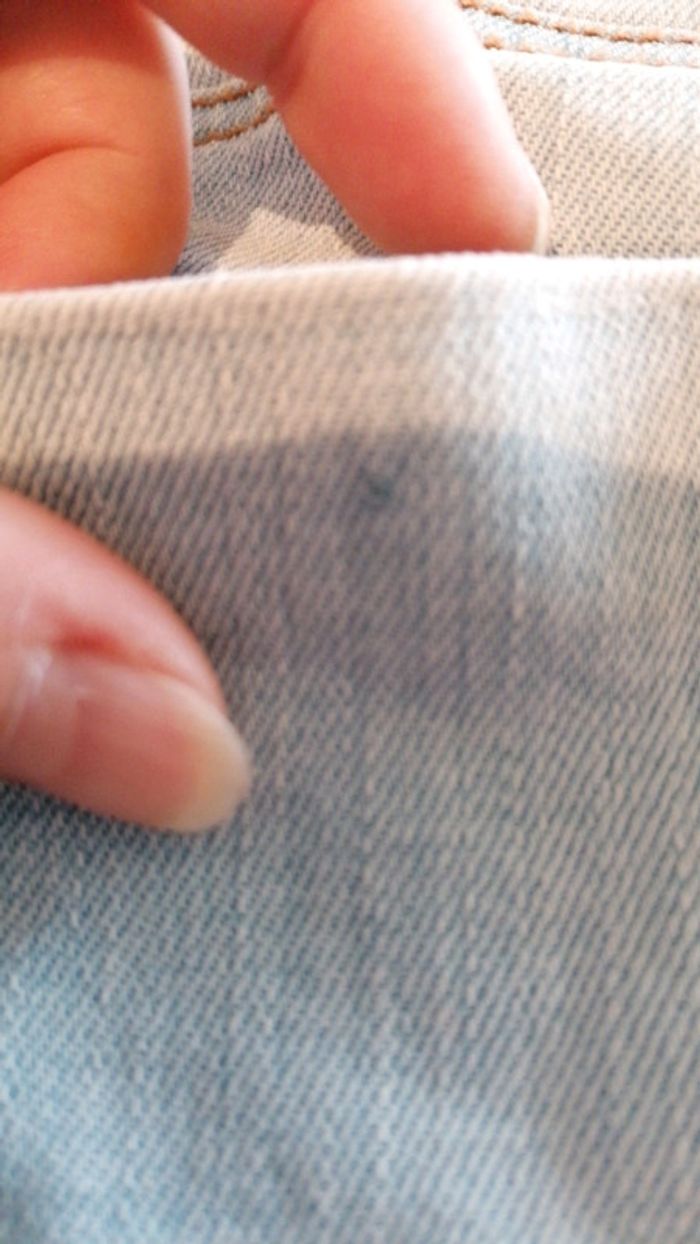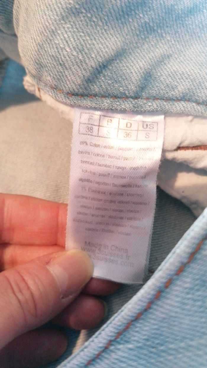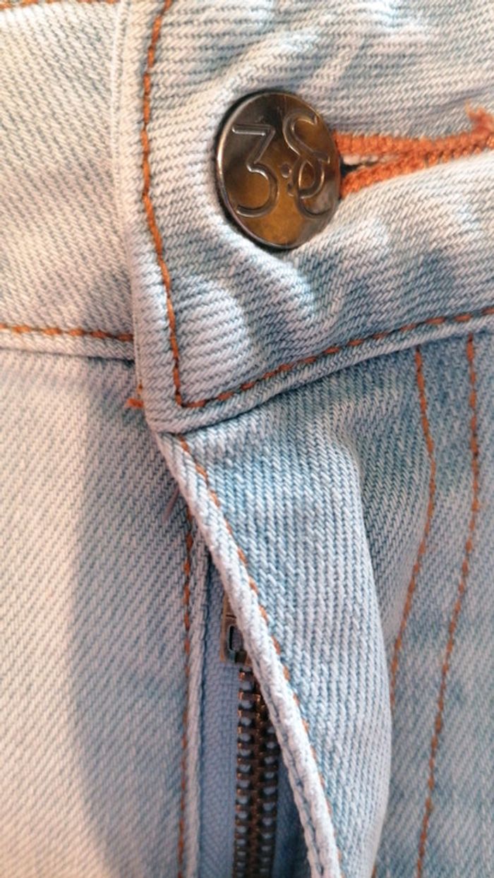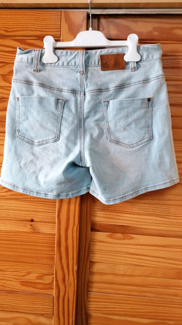 Short 3 suisses en jean taille 38 bleu clair effet délavé... Poches latérales et fermeture par bouton et fermeture éclair... Poches à l'arrière... Déjà bien porté donc deux petits fils tirés (voir photos) mais reste en bon état #gwen89350taille38 #gwen89350vintage