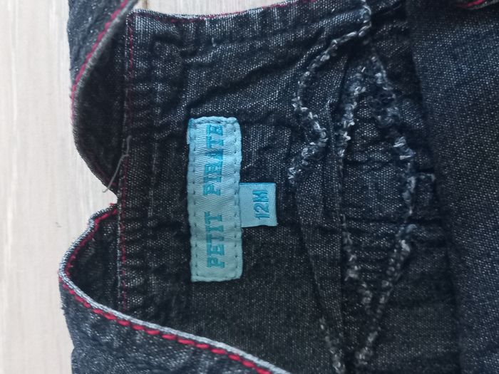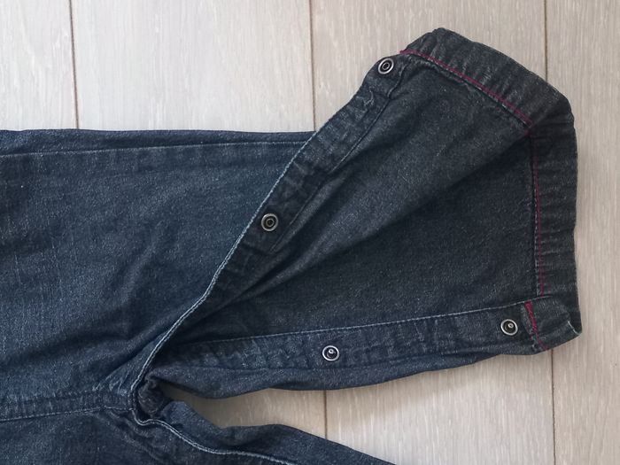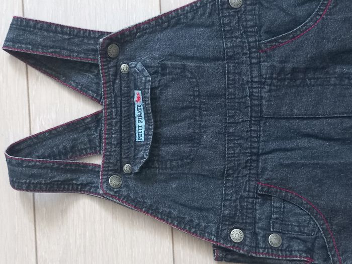 salopette en jean avec bretelles réglables (2 hauteurs) et jambes avec boutons pressions (pratique pour le change). Marque "petit pirate"