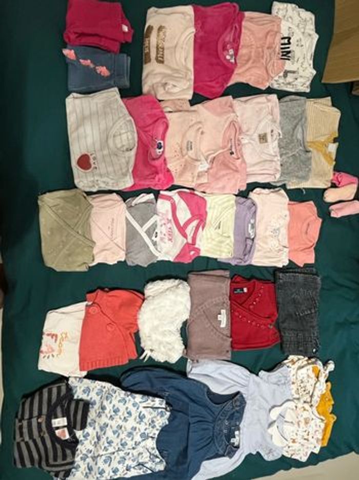 11 pyjamas 8 bodies 4 gilets 4 robes 2 pantalons 1 ensemble short 2 gigoteuses été 3 paires de chaussettes 2 collant