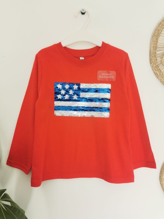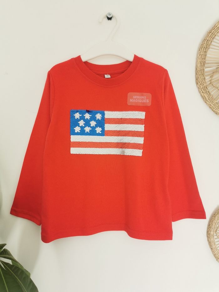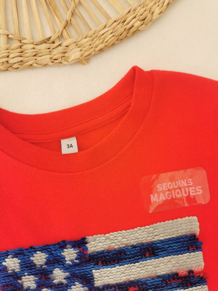 🧒 Tee-shirt 👕 à sequins magiques 🧒 🖊️ ÉTAT ✅️: Parfait👌 - Jamais porté 🆕 🖊️ DESCRIPTION 👕: ▪️Taille 3 Ans ▪️Matière: 61% coton -39% polyester ▪️Col rond ▪️Manches longues ▪️Sequins réversibles sur la poitrine - Drapeau des États Unis 🇺🇸 ▪️Couleur: Rouge 🔴 🟤
