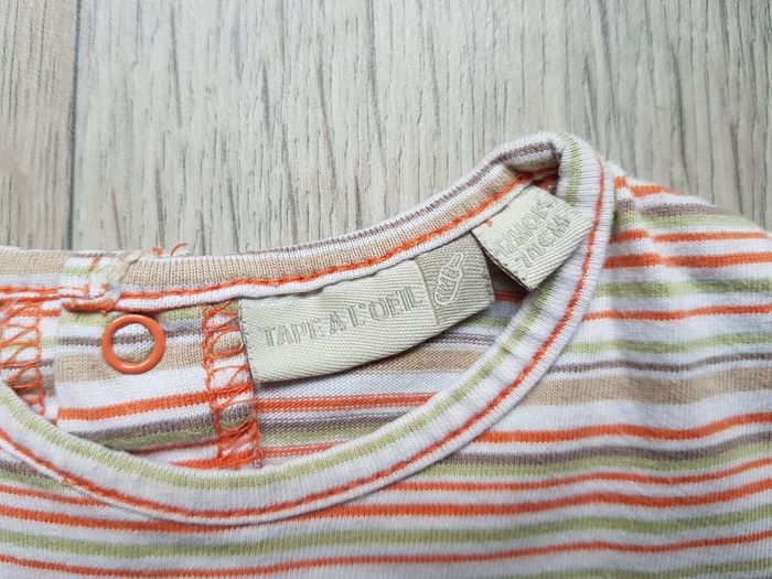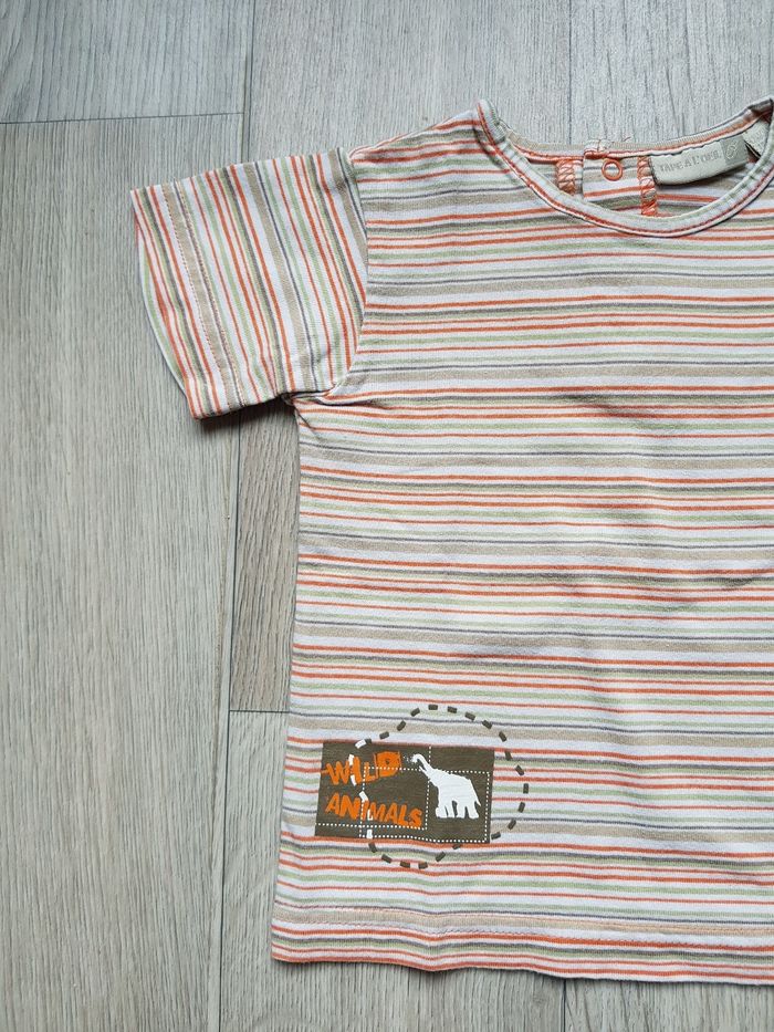 T-shirt Manches courtes, à rayures, Orange, vert anis, gris, blanc et taupe, petit motif, 100% Coton 12 mois / TAPE À L'OEIL / Garçon Très bon état