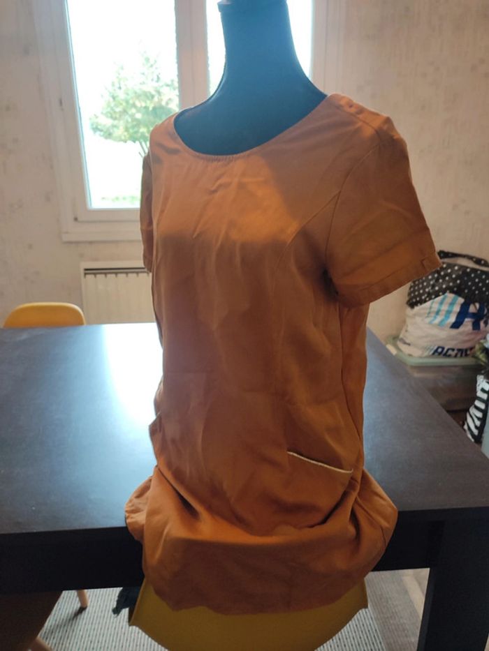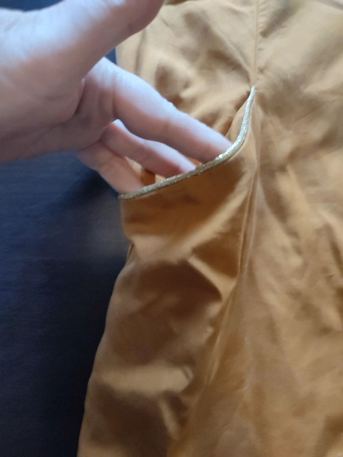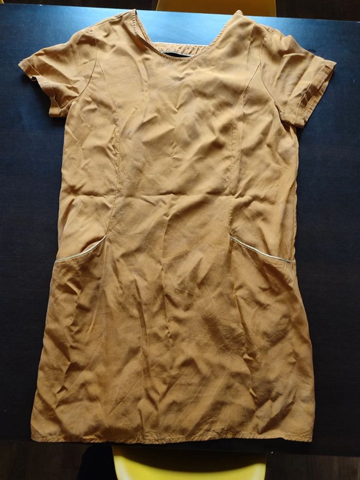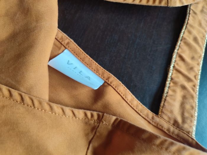 Robe VILA Moutarde Manches courtes avec revers 2 poches bordées d'un liseré or Découpe dans le dos bordé également d'un liséré or 100% Lyocel TAILLE 40 TRES BON ETAT Allez voir mes autres ventes!