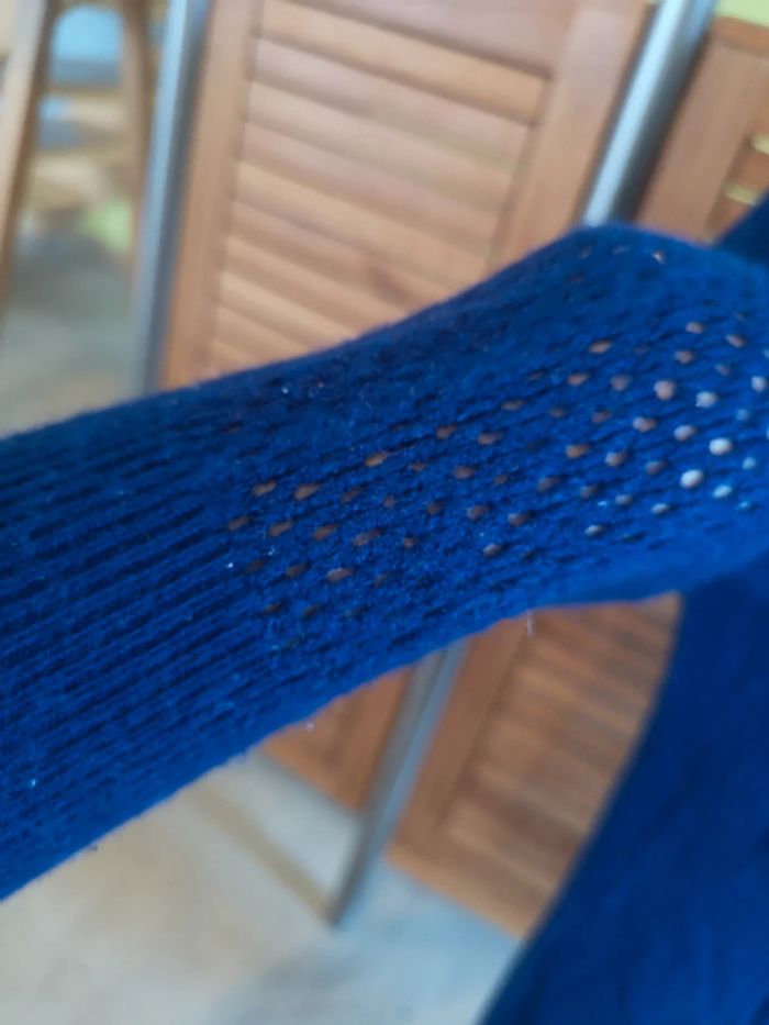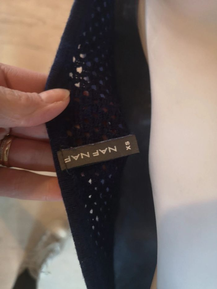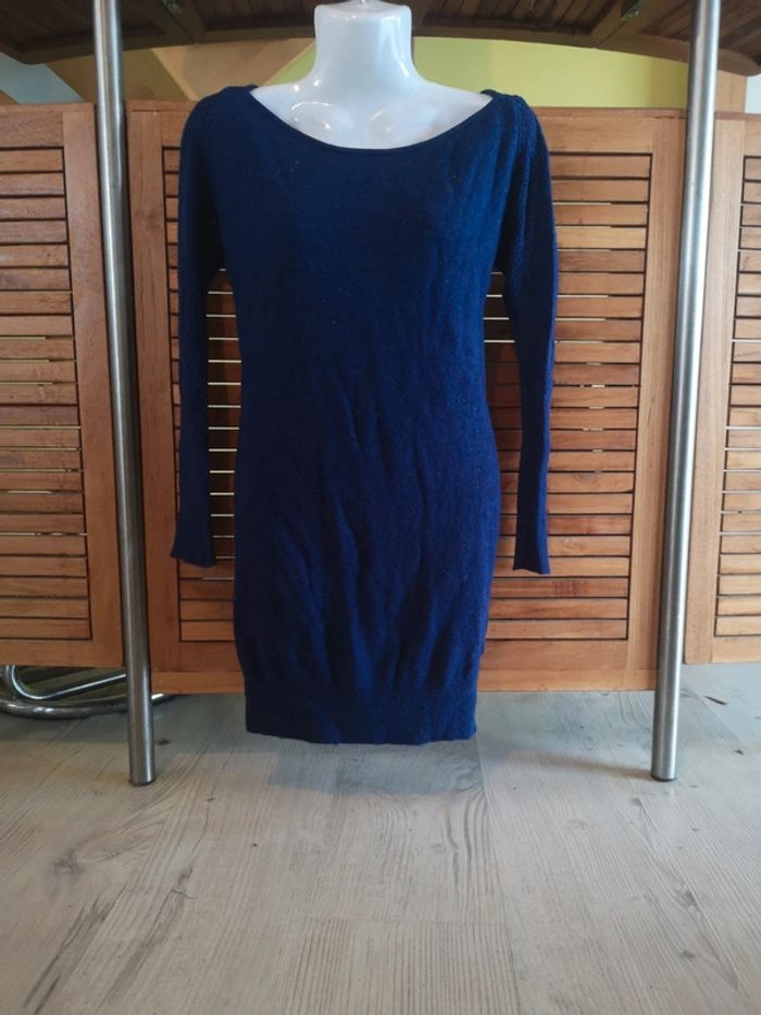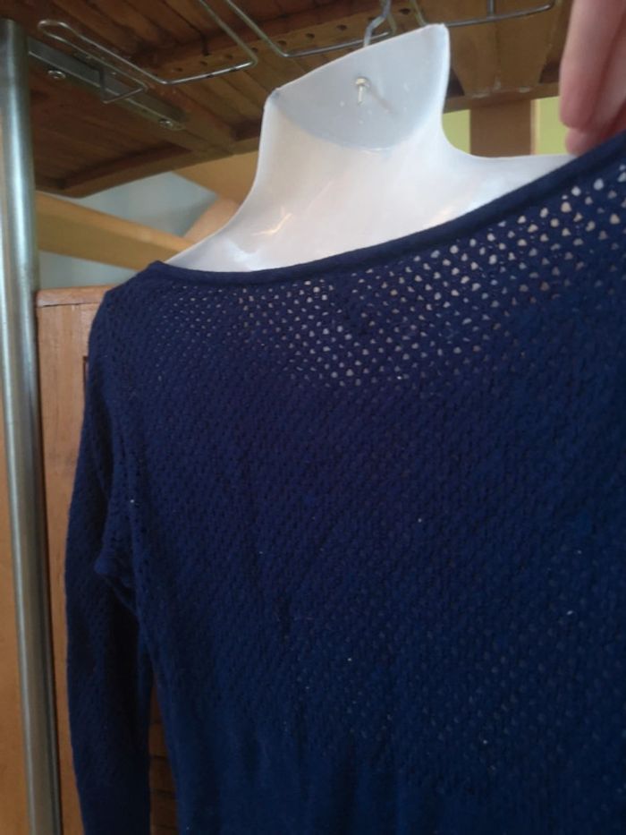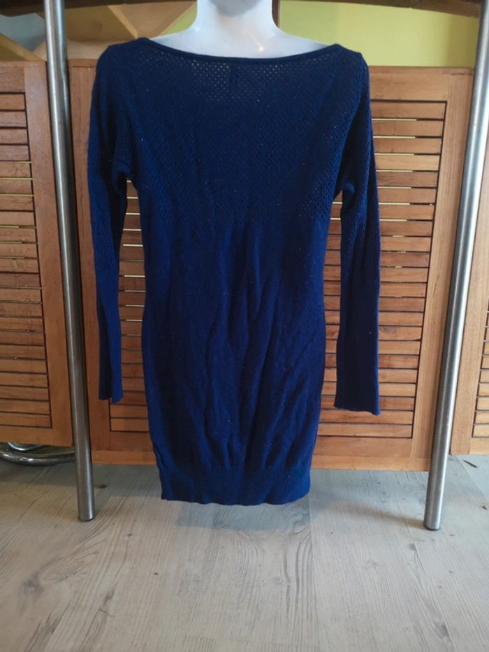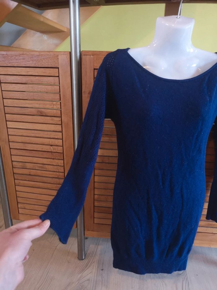 Robe pull bleu foncé NafNaf, manches longues avec parties ajourées, haut du dos ajouré (Cf photos)