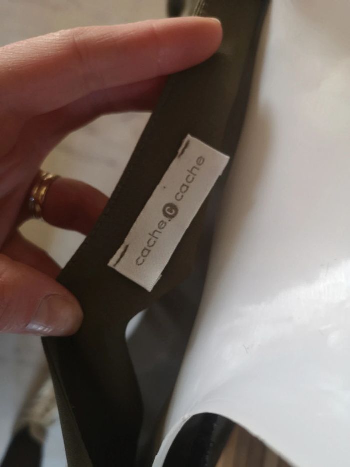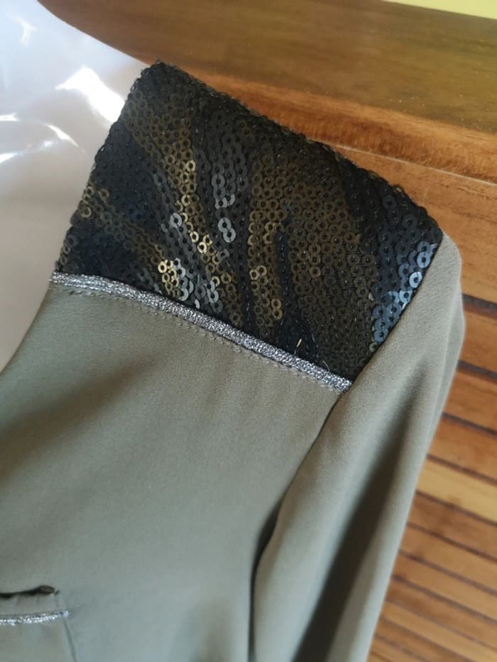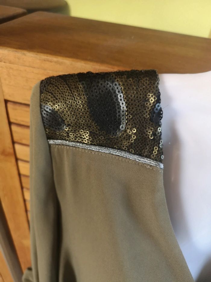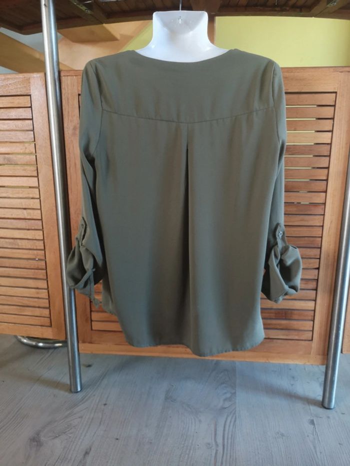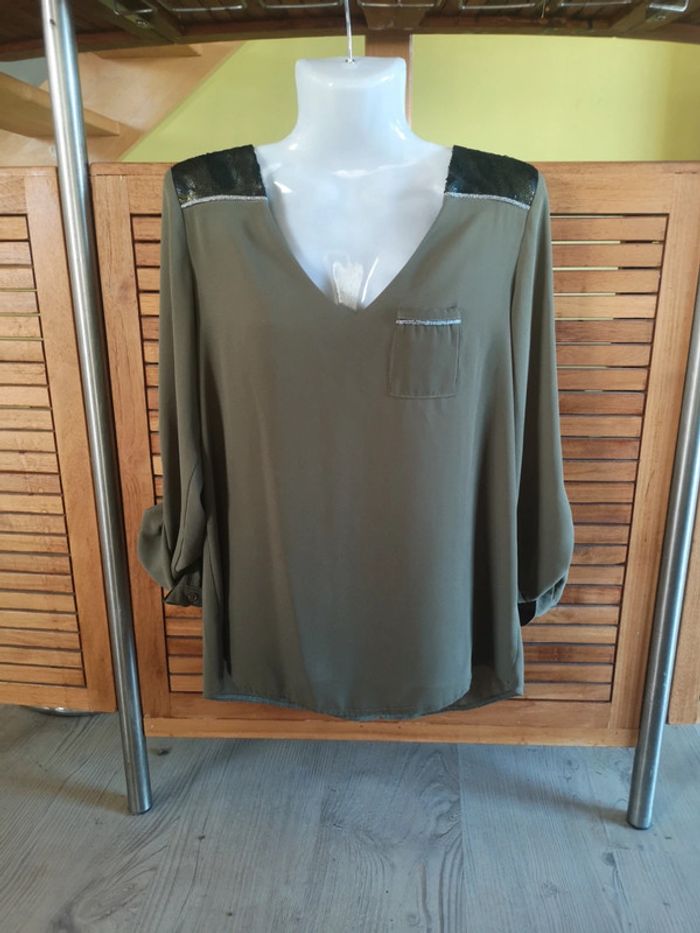 Blouse kaki épaules strass, fluide, manches longues possible 3/4 par lien avec bouton