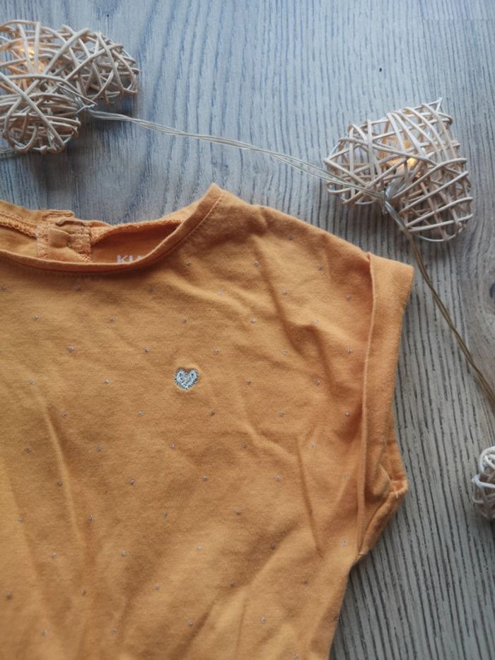 Robe matière tee-shirt, élastiquée à la taille, boutons derrière, couleur moutarde, détails brillants : points partout et cœur (cf photo)