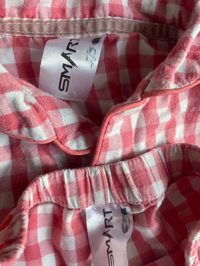 Pyjama deux pièces de la marque Smart Taille 4/5 ans (étiquette 6/8 ans mais taille vraiment petit) Couleurs rose et blanc Petites traces d’utilisation Occasion, bon état