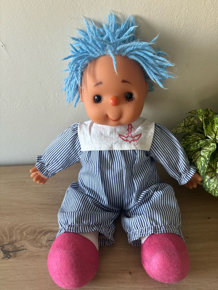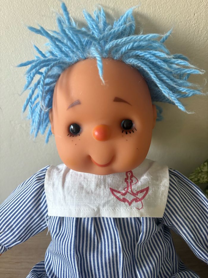 Vintage ancienne poupée en chiffon cheveux laine bleu