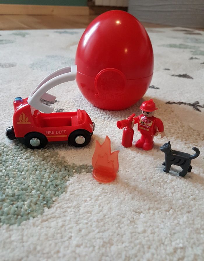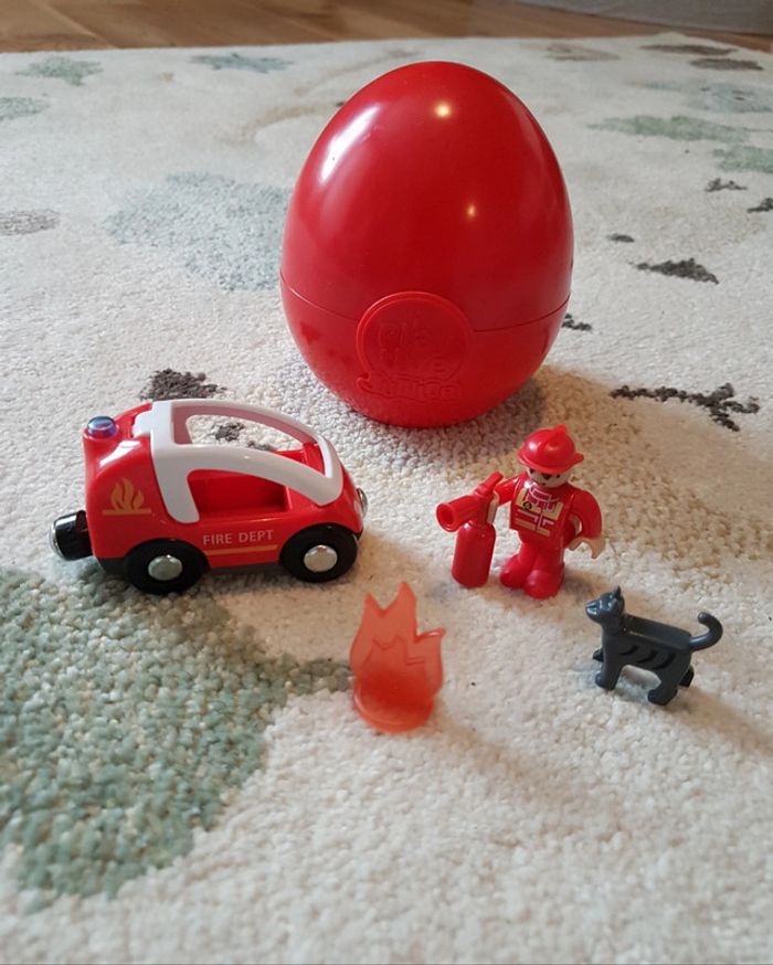 Oeuf Playtive Pompier complet 1 pompier + 1 camion + 1 extincteur + 1 chat + 1 feu Servi mais très bon état Dans emballage d'origine