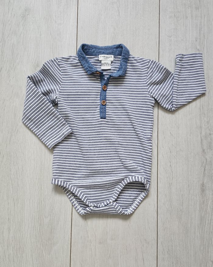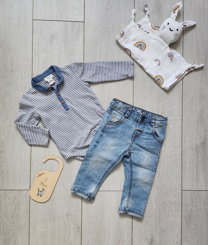 Très bel ensemble,en très bon état : - 1 Body/Polo Cyrillus - 1 Jean bleu clair delavé Gemo Taille 12 mois.