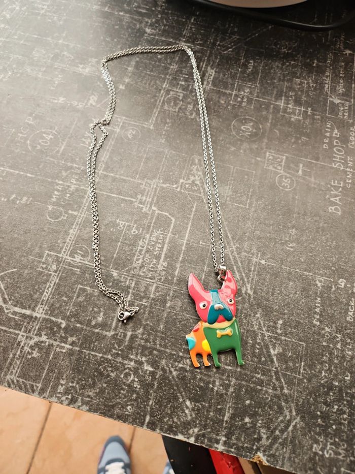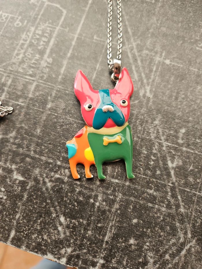 Collier long avec pendentif chien multicolore en tres bon état #collierlong #collierfemme #pendentifchien
