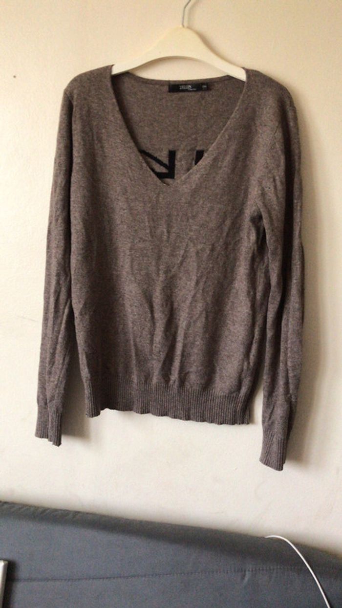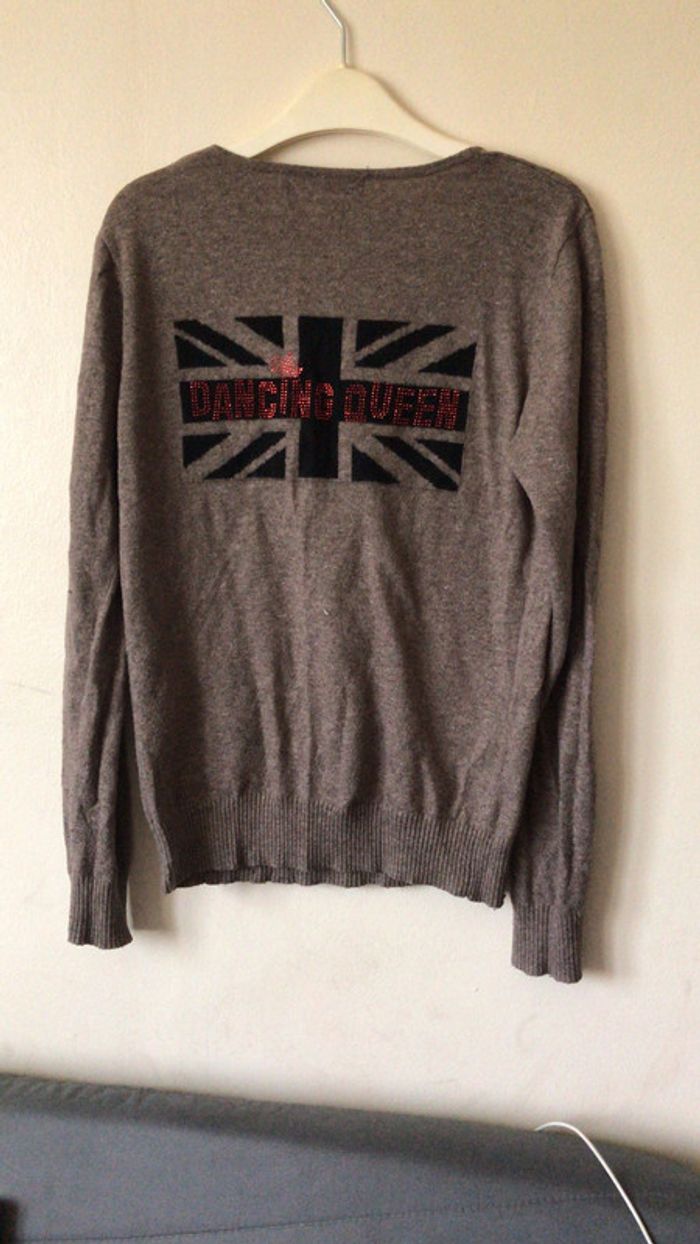 coucou je vend ce pull taille s/m couleur taupe femme il manque un strass sur le dessin au dos pour plus d’infos ou de photos n’hésitez pas 😀