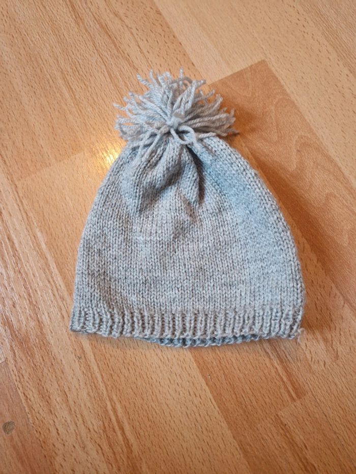 Bonnet gris pour bébé Tricoté à la main Hauteur 16cm + pompom Largeur 17cm -> tour de tête 34cm